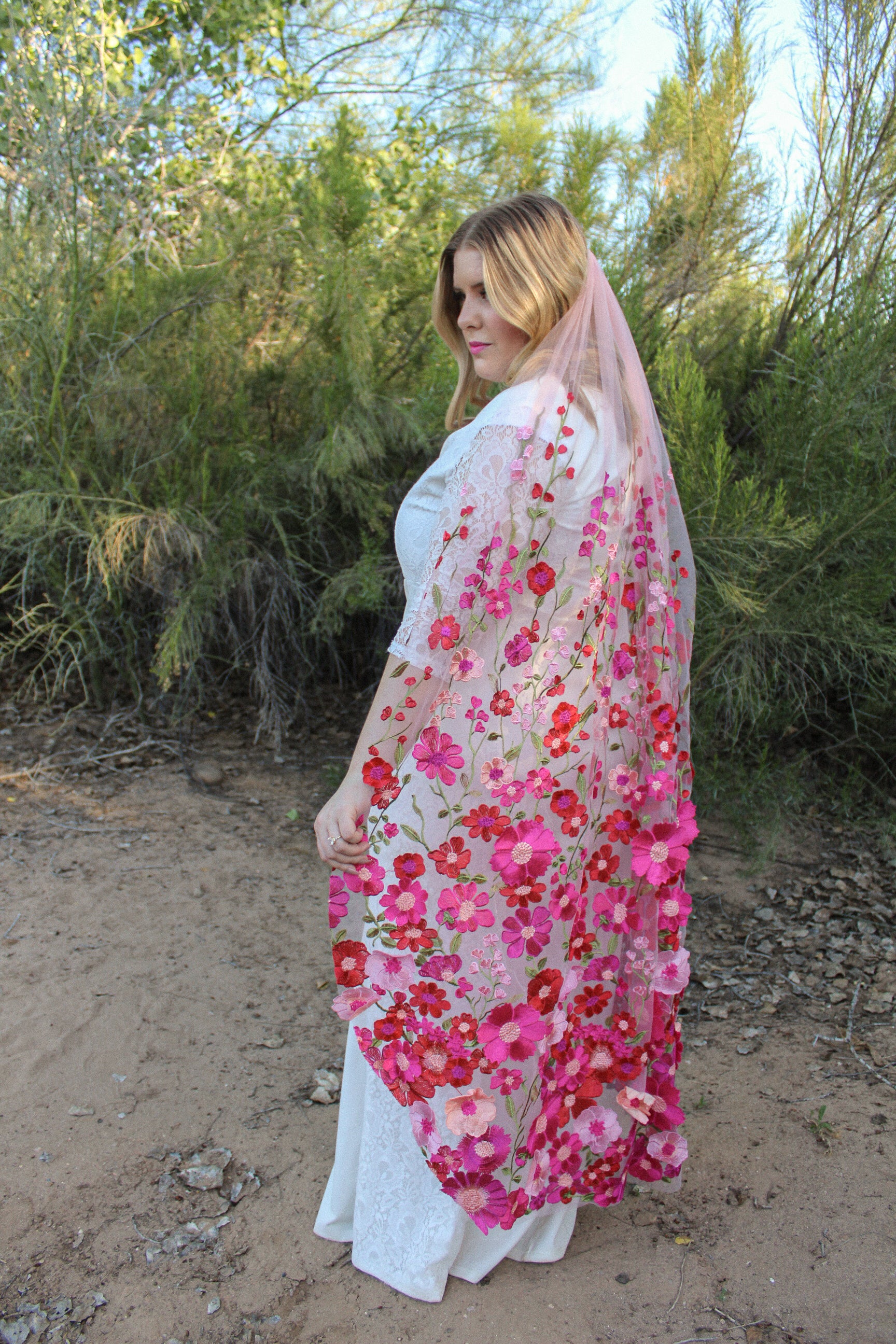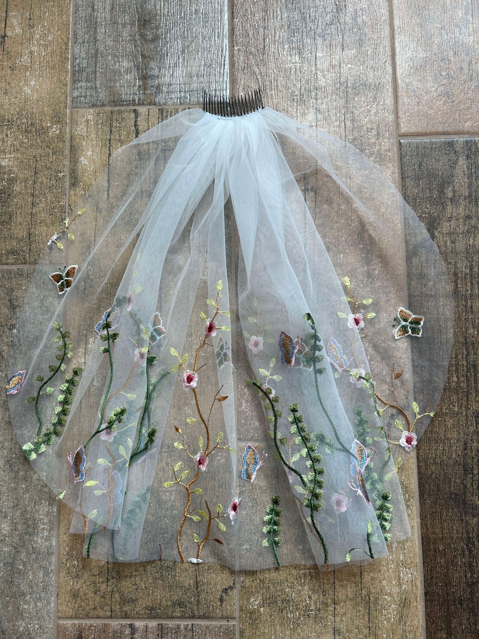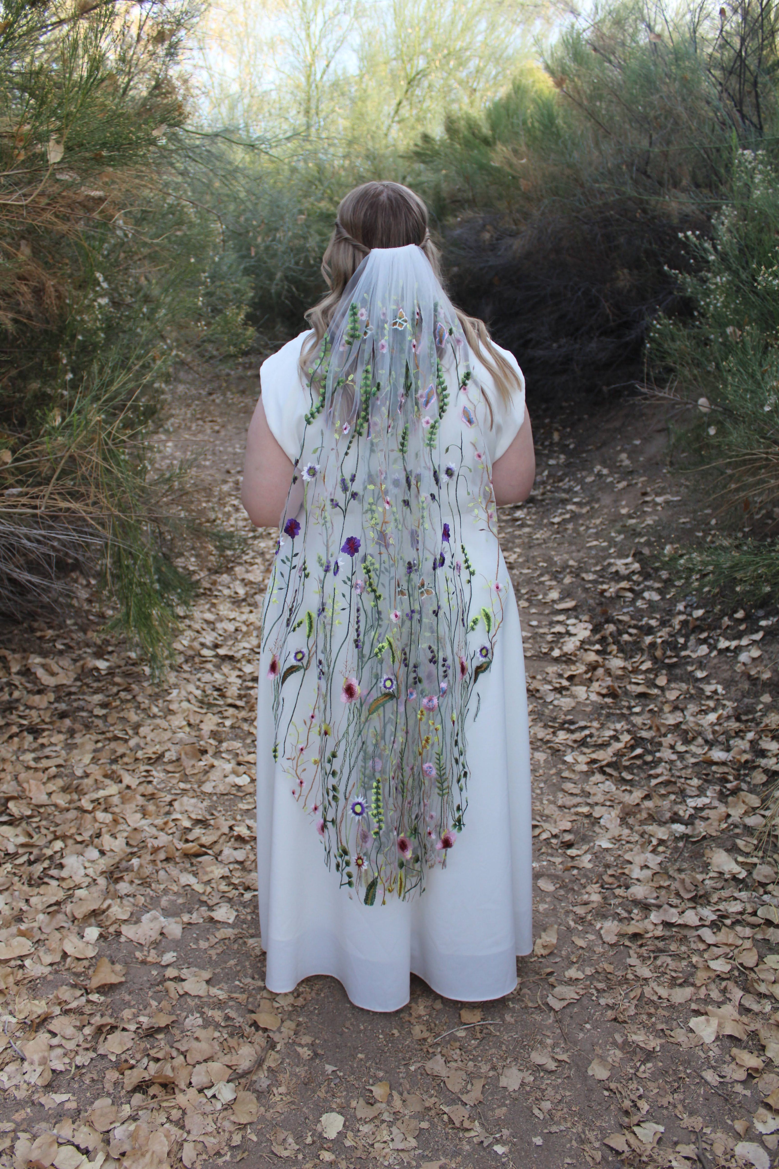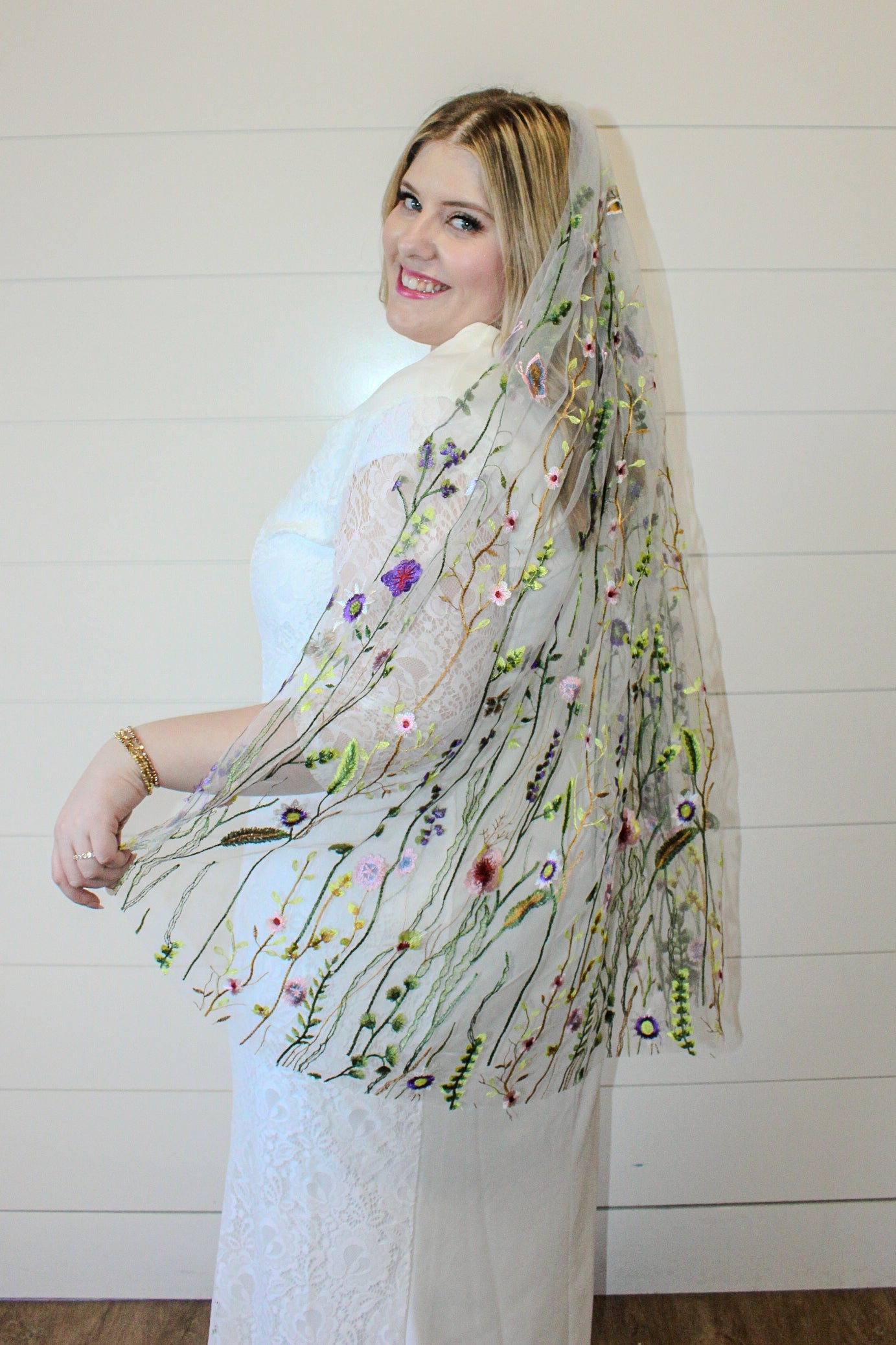 Deciding what veil length is one of the most major veil designs you will make! The decision is completely up to you, but this guide is here to guide you in the right direction based on personal preferences and dress styles. Where you veil lands on your body/floor depends on your height as well as where the veil is placed on your head. As always, please feel free to send photos of your wedding dress for our best guidance on length.