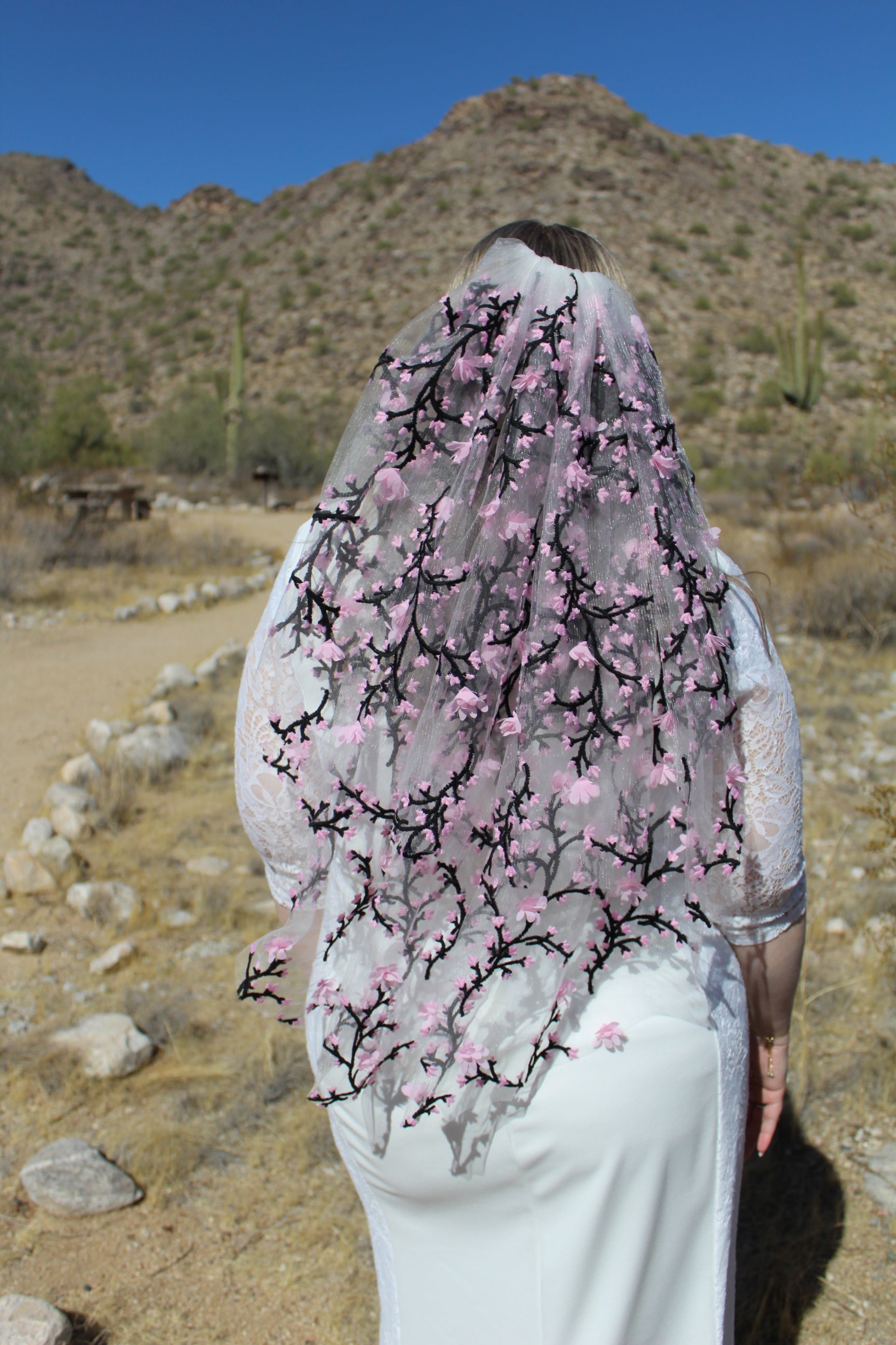 White tulle with 3d pink flowers & black vines. Two Tiers 18"/28". Cut edge. Hand sewn to a metal comb (1 available).