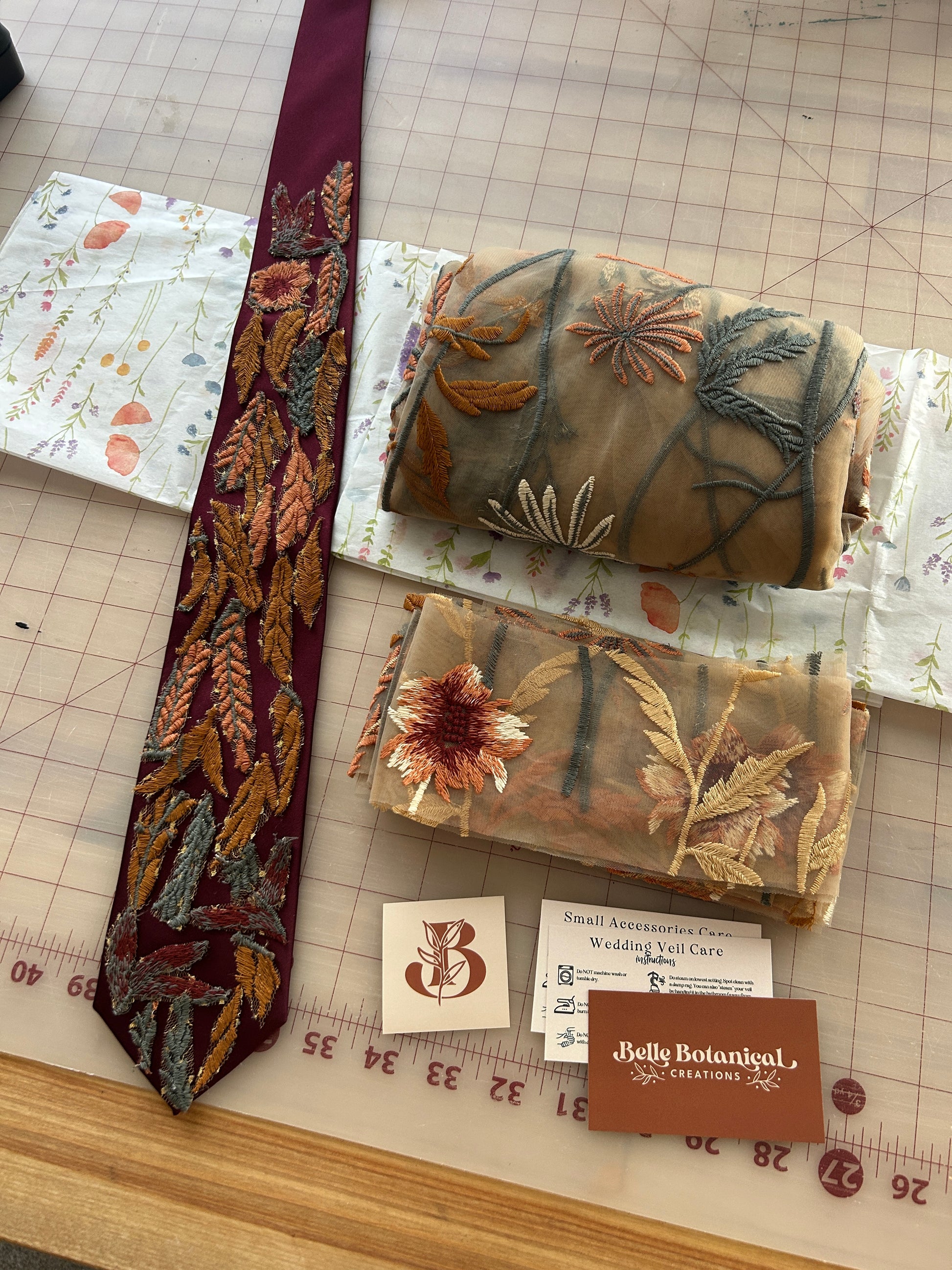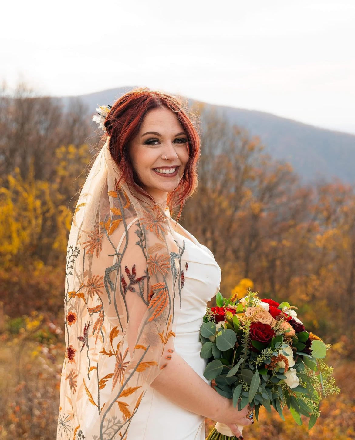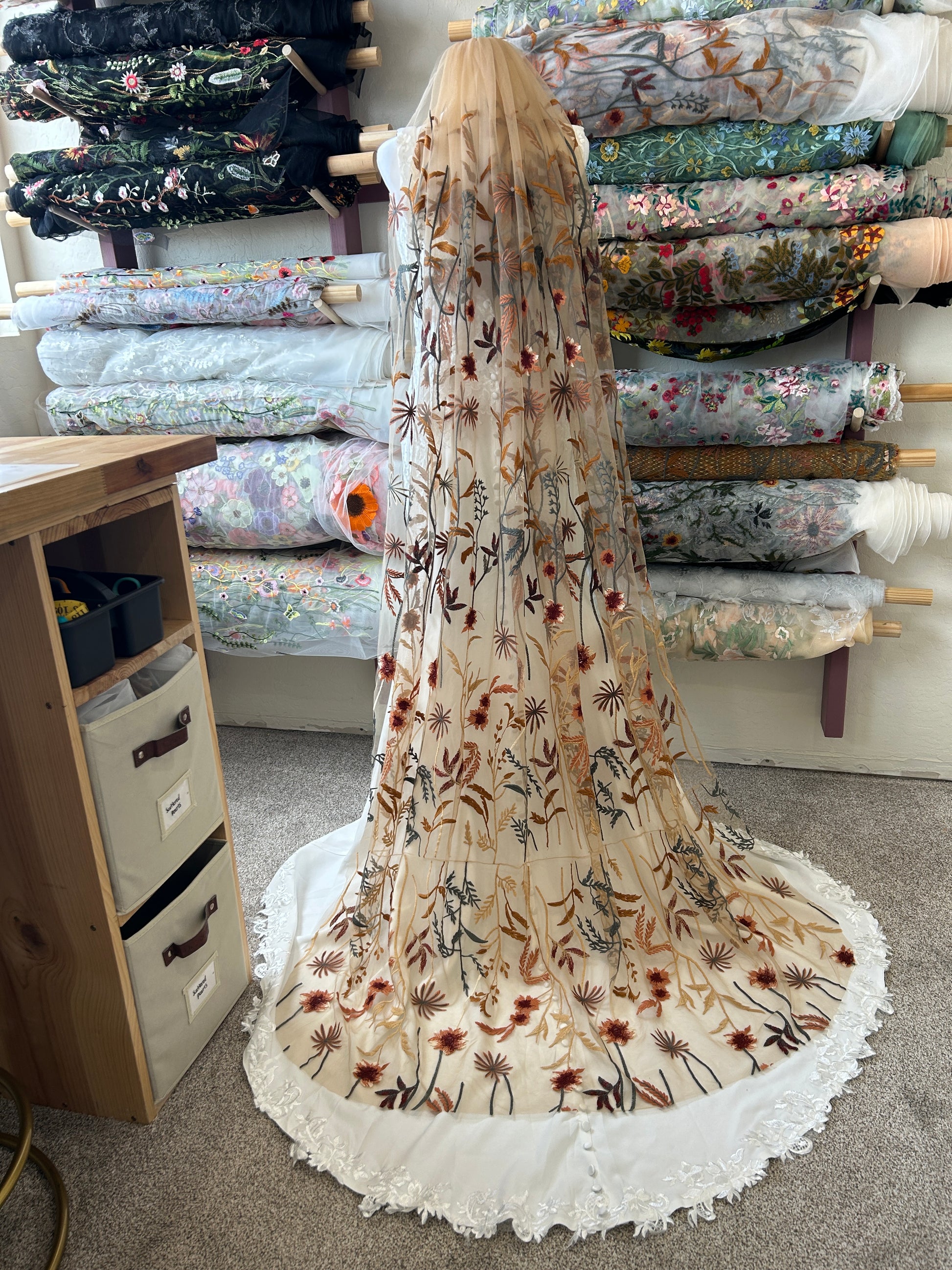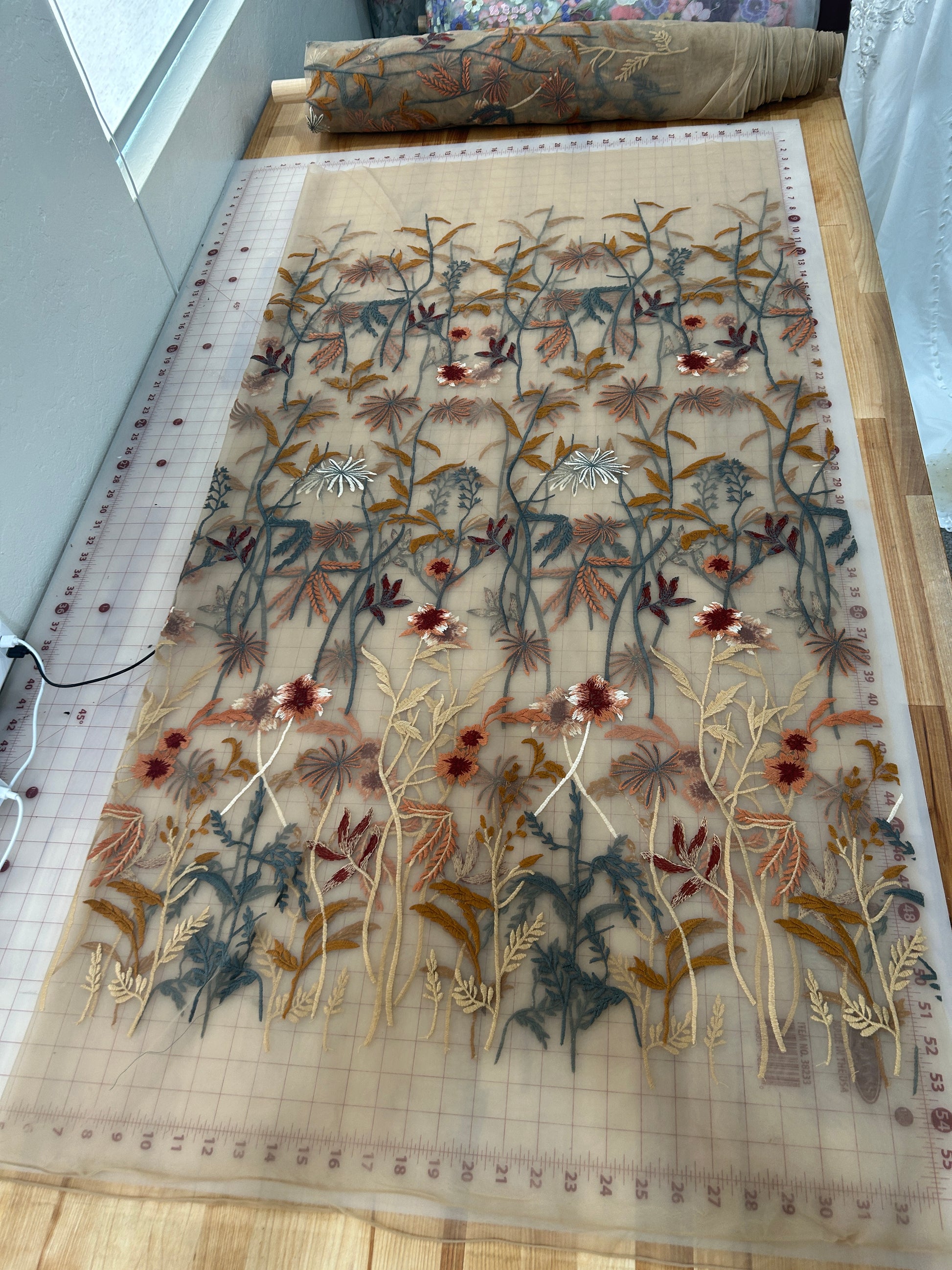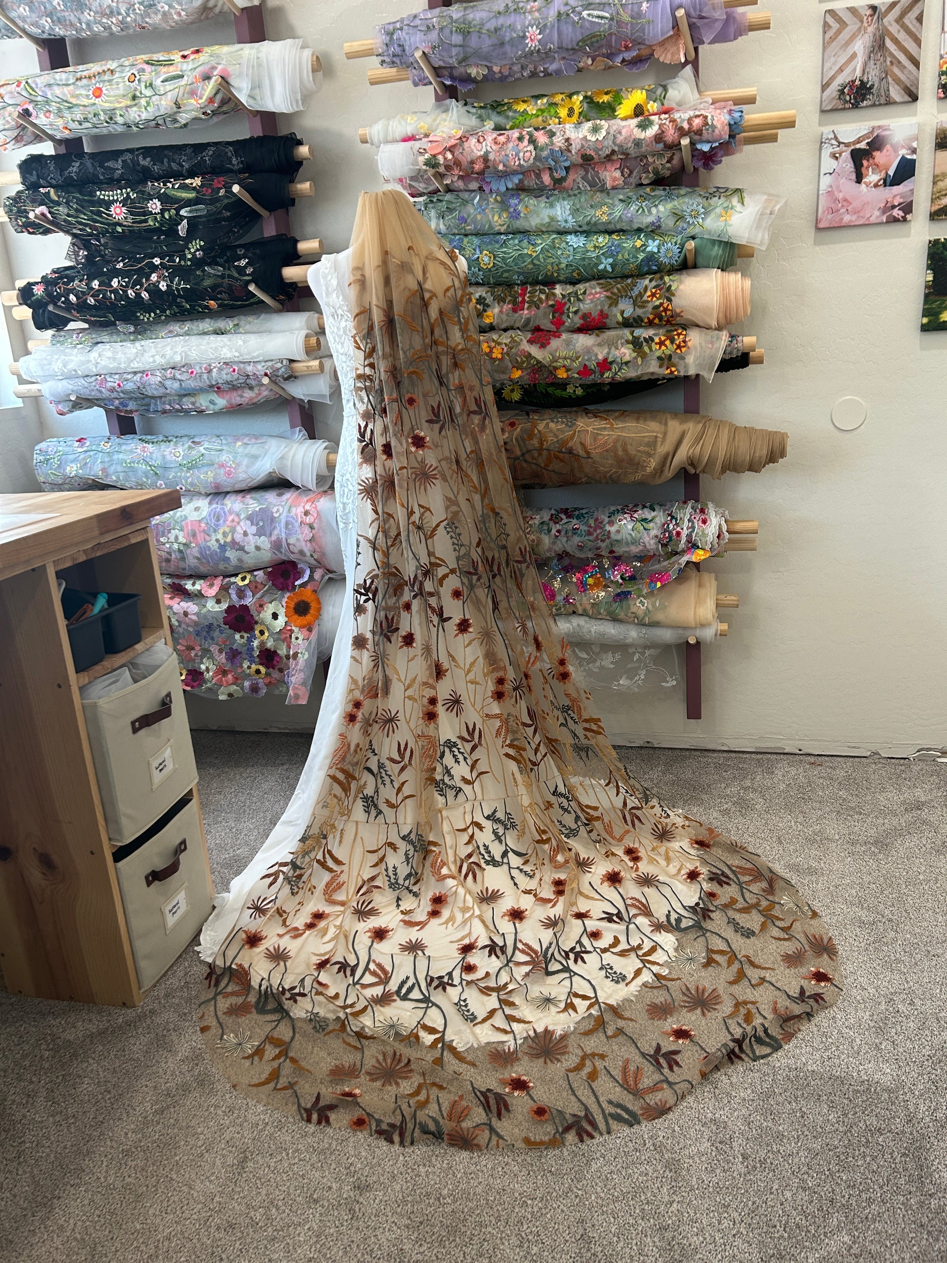 - Tan tulle with autumn themed leaves, greenery & flowers embroidered