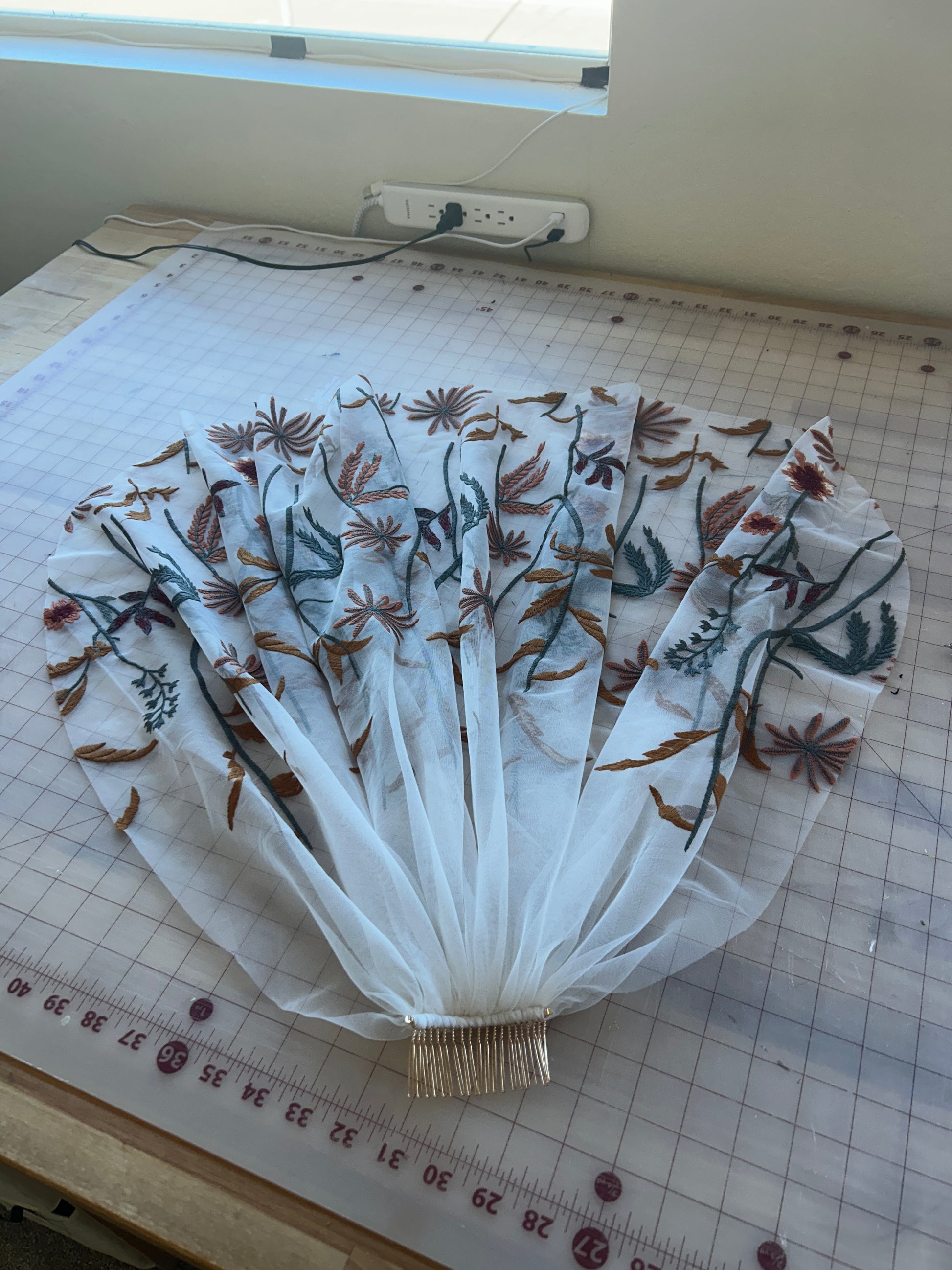 Lengths of floor, chapel & cathedral: The embroidered design finishes 50" tall, so additional length is added by a small seam, blending the fabric together vertically. Small stitches follow a straight line along the veil & seam both ends of fabric together, giving reflected a longer length.