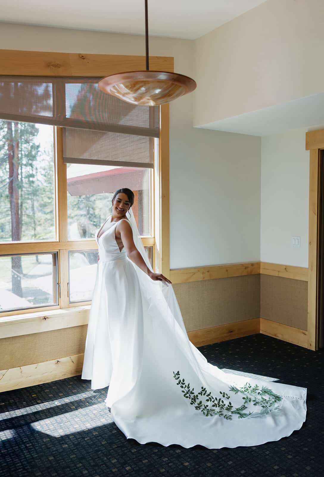 • Greenery vines and leaves that are carefully placed near the bottom of the train, to almost make it feel like the forest is creeping up on your veil. Almost like your veil is mirroring the beautiful nature all around you.