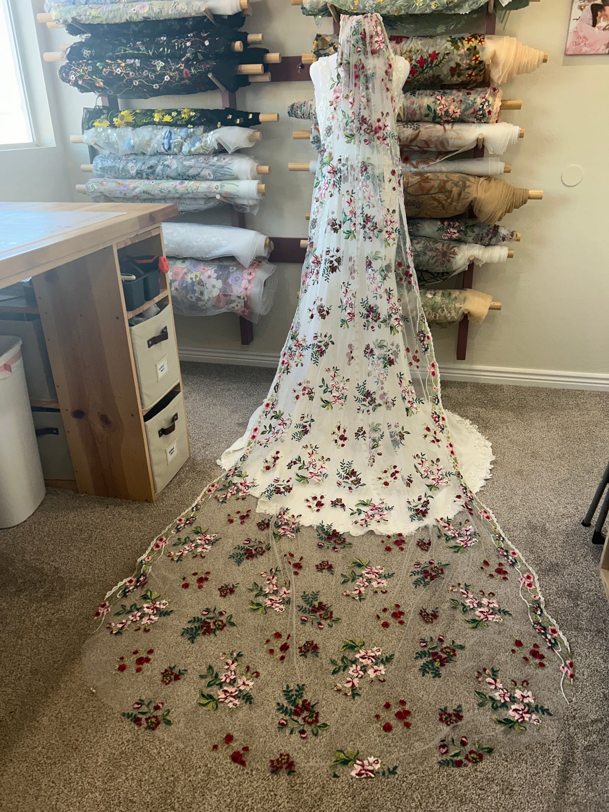 - Creamy off-white tan or white tulle base with embroidered flowers and greenery