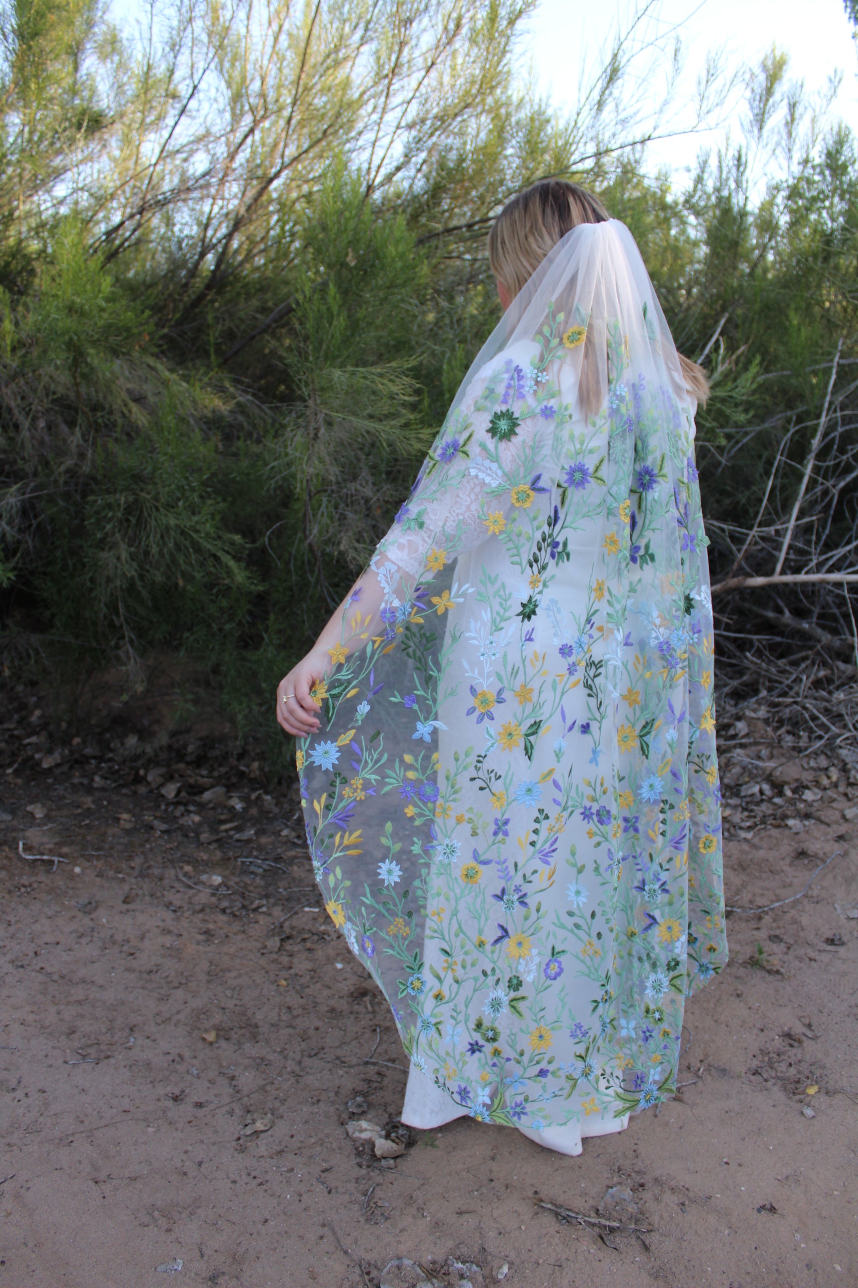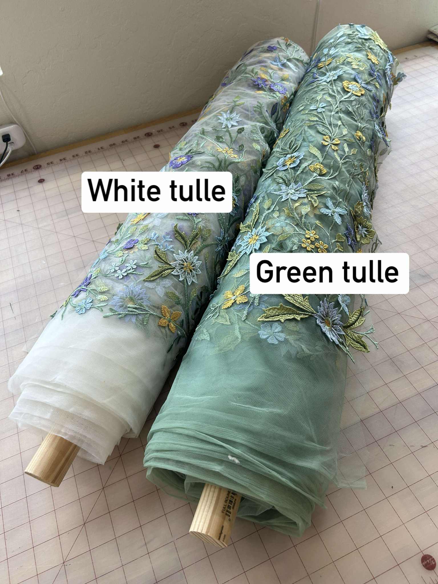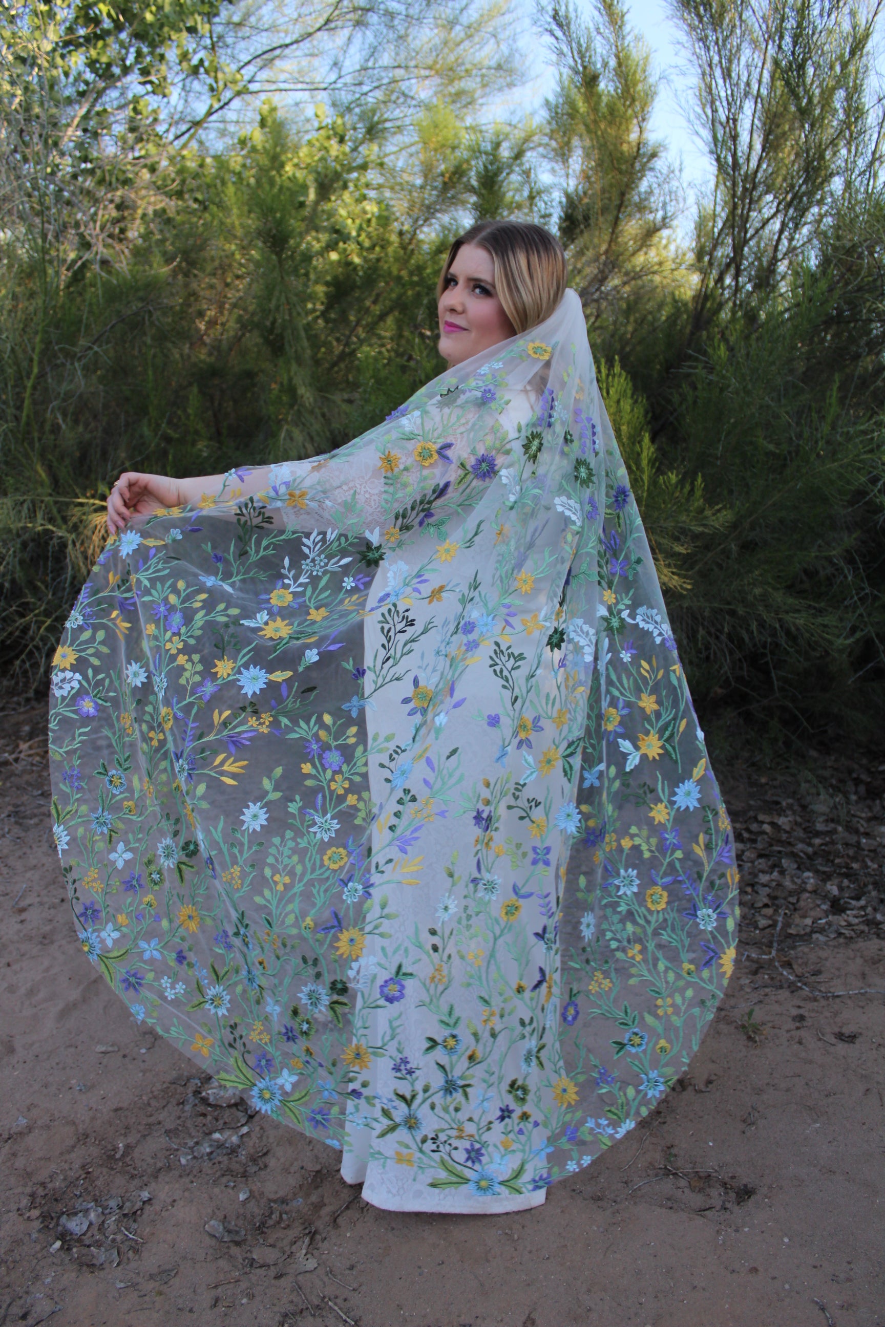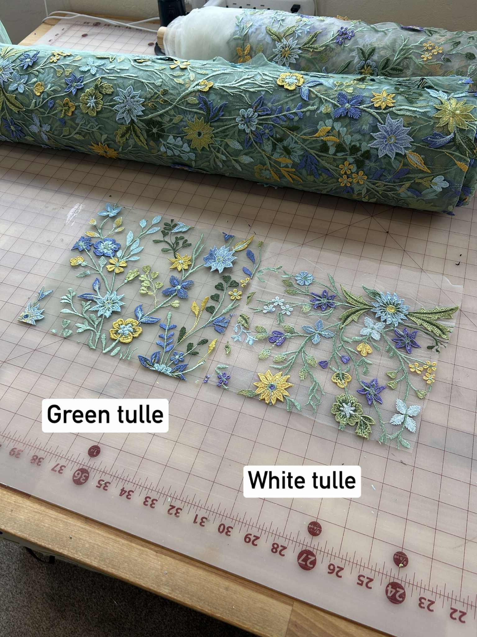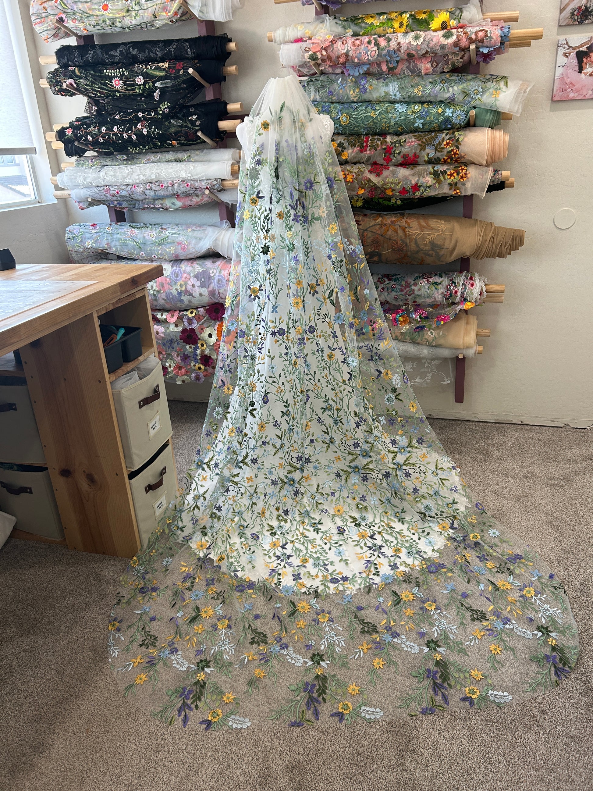 Lengths of floor, chapel & cathedral: The embroidered design finishes 50" tall, so additional length is added by a small seam, blending the fabric together vertically. Small stitches follow a straight line along the veil & seam both ends of fabric together, giving a longer length.