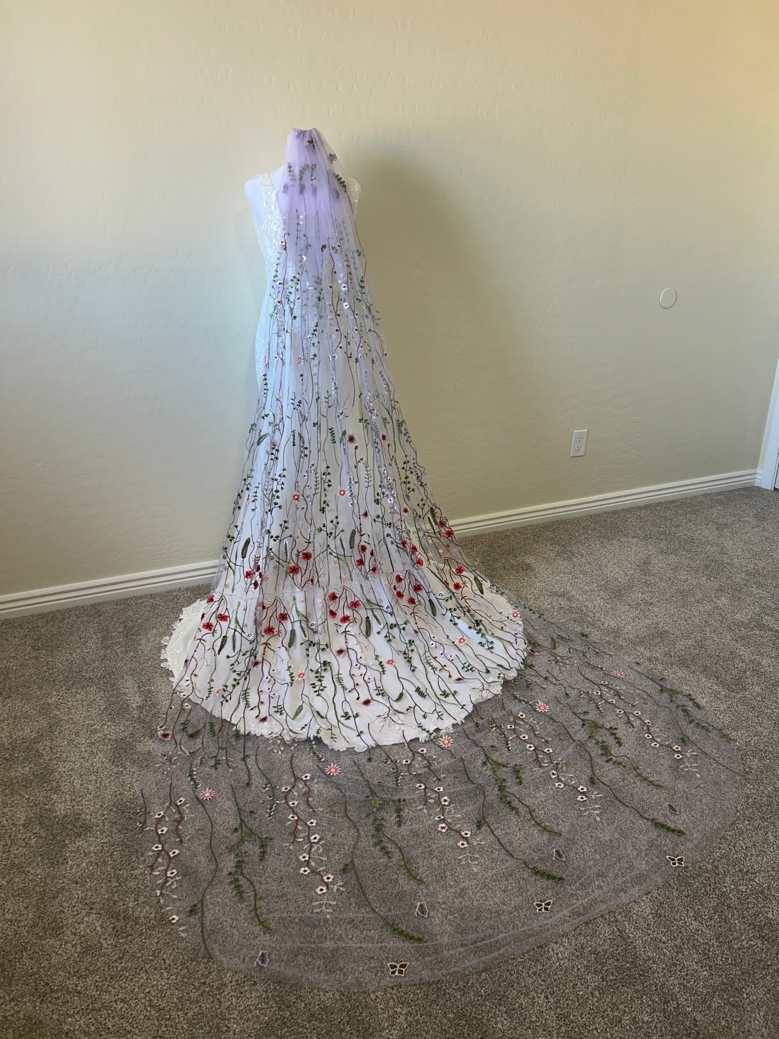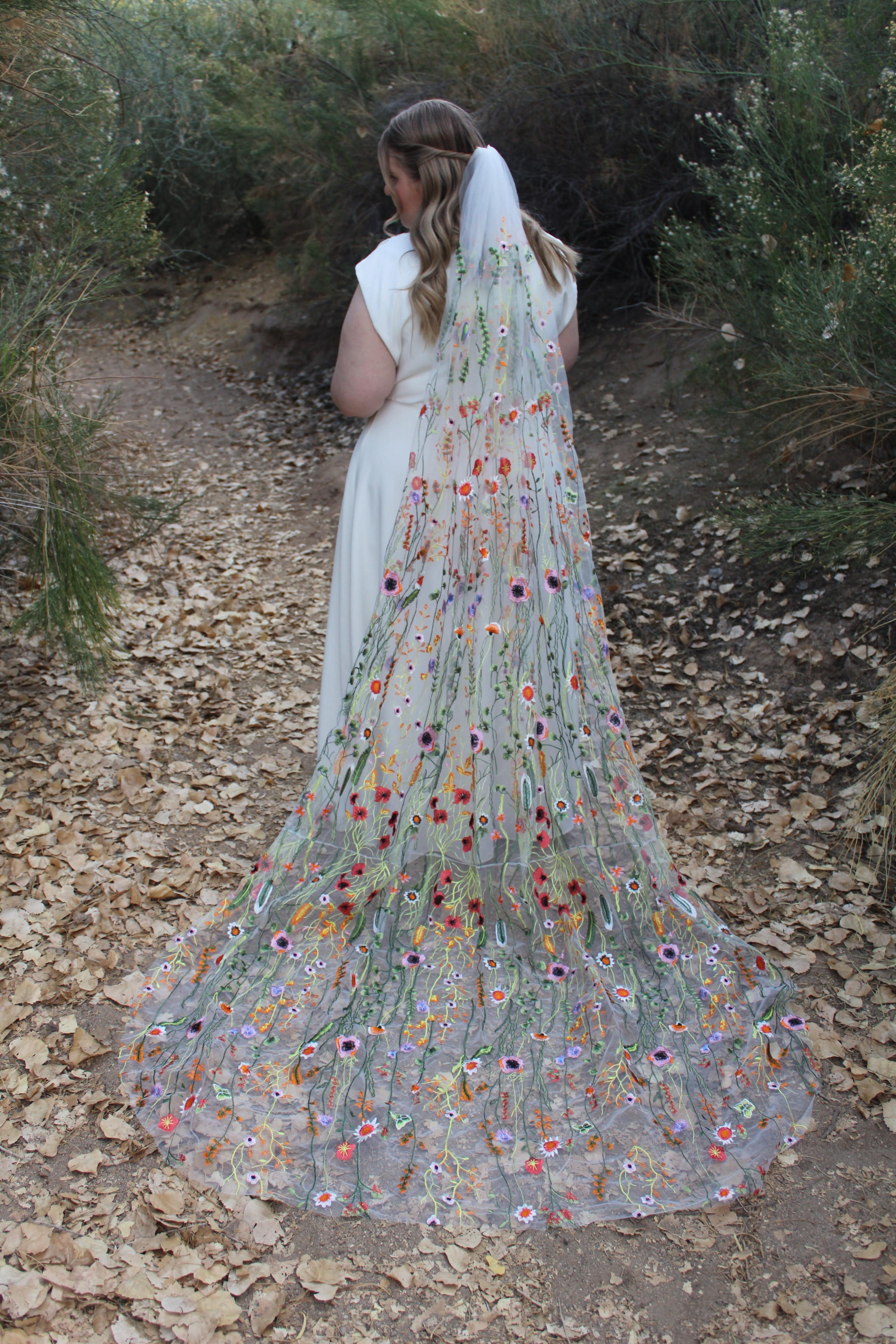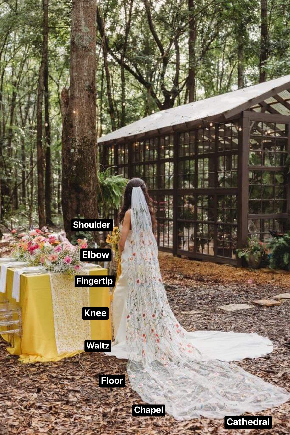 Deciding what veil length is one of the most major veil designs you will make! The decision is completely up to you, but this guide is here to guide you in the right direction based on personal preferences and dress styles. Where you veil lands on your body/floor depends on your height as well as where the veil is placed on your head. As always, please feel free to send photos of your wedding dress for our best guidance on length.