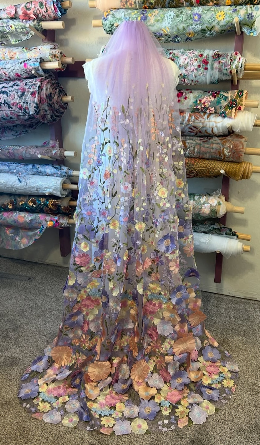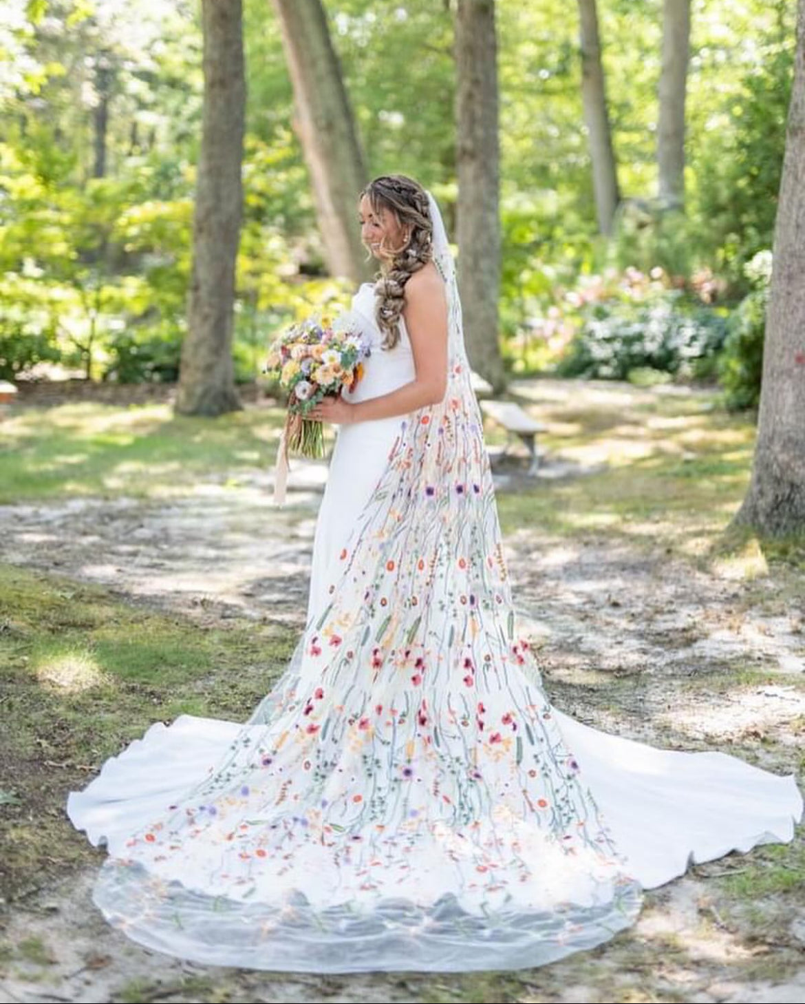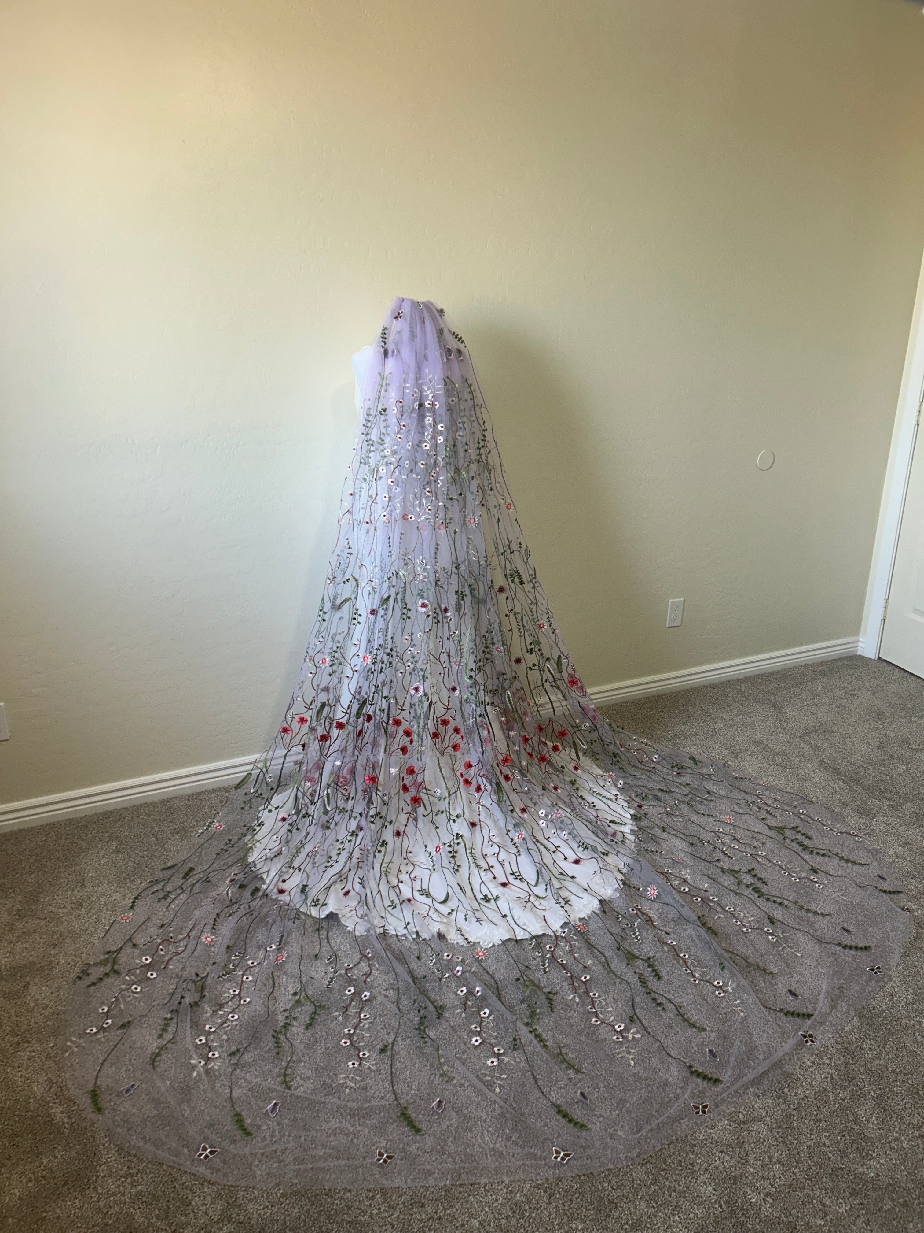 Deciding what veil length is one of the most major veil designs you will make! The decision is completely up to you, but this guide is here to guide you in the right direction based on personal preferences and dress styles. Where you veil lands on your body/floor depends on your height as well as where the veil is placed on your head. As always, please feel free to send photos of your wedding dress for our best guidance on length.