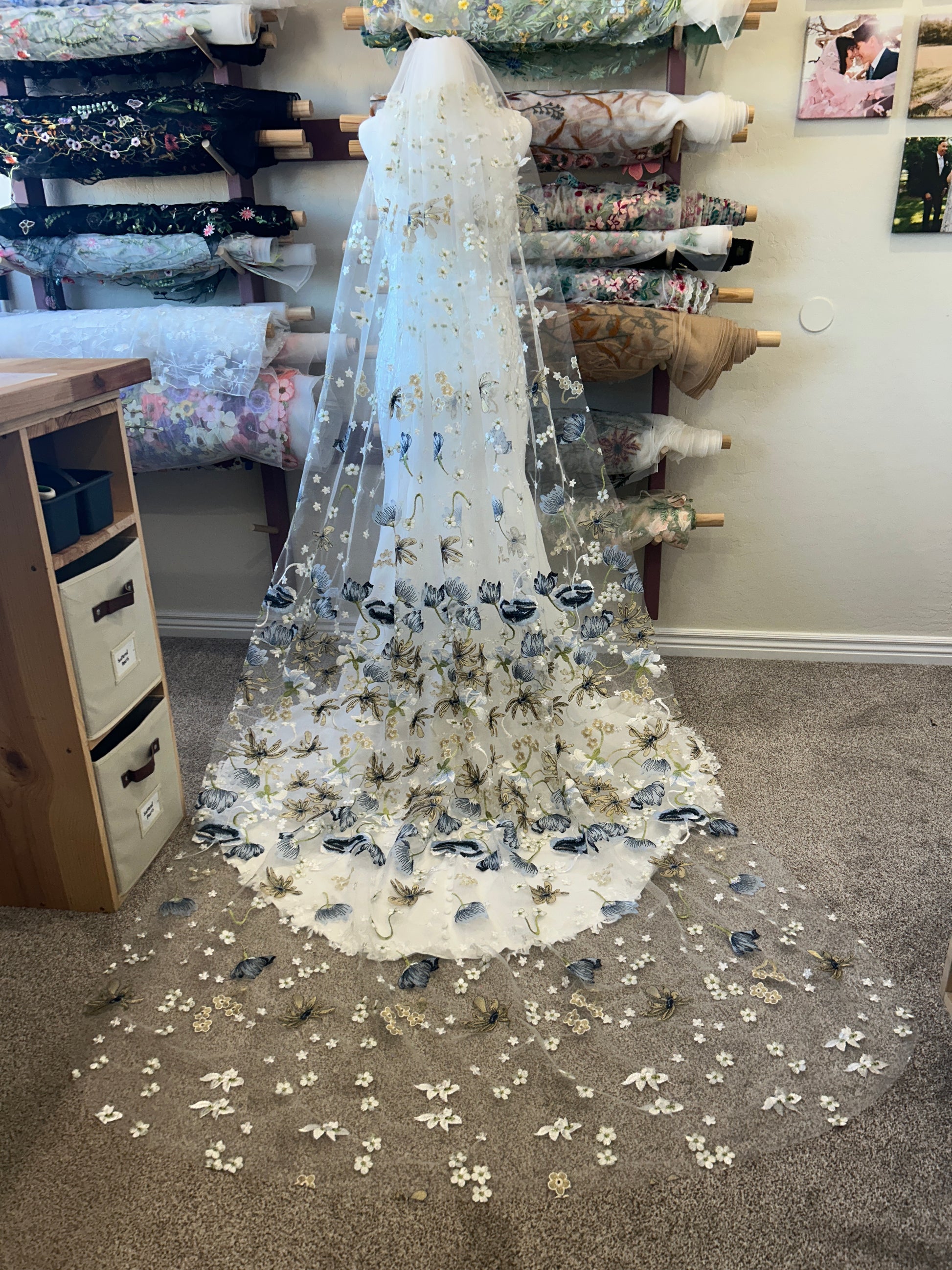 Lengths of floor, chapel & cathedral: The embroidered design finishes 50" tall, so additional length is added by a small seam, blending the fabric together vertically. Small stitches follow a straight line along the veil & seam both ends of fabric together, giving reflected a longer length.
