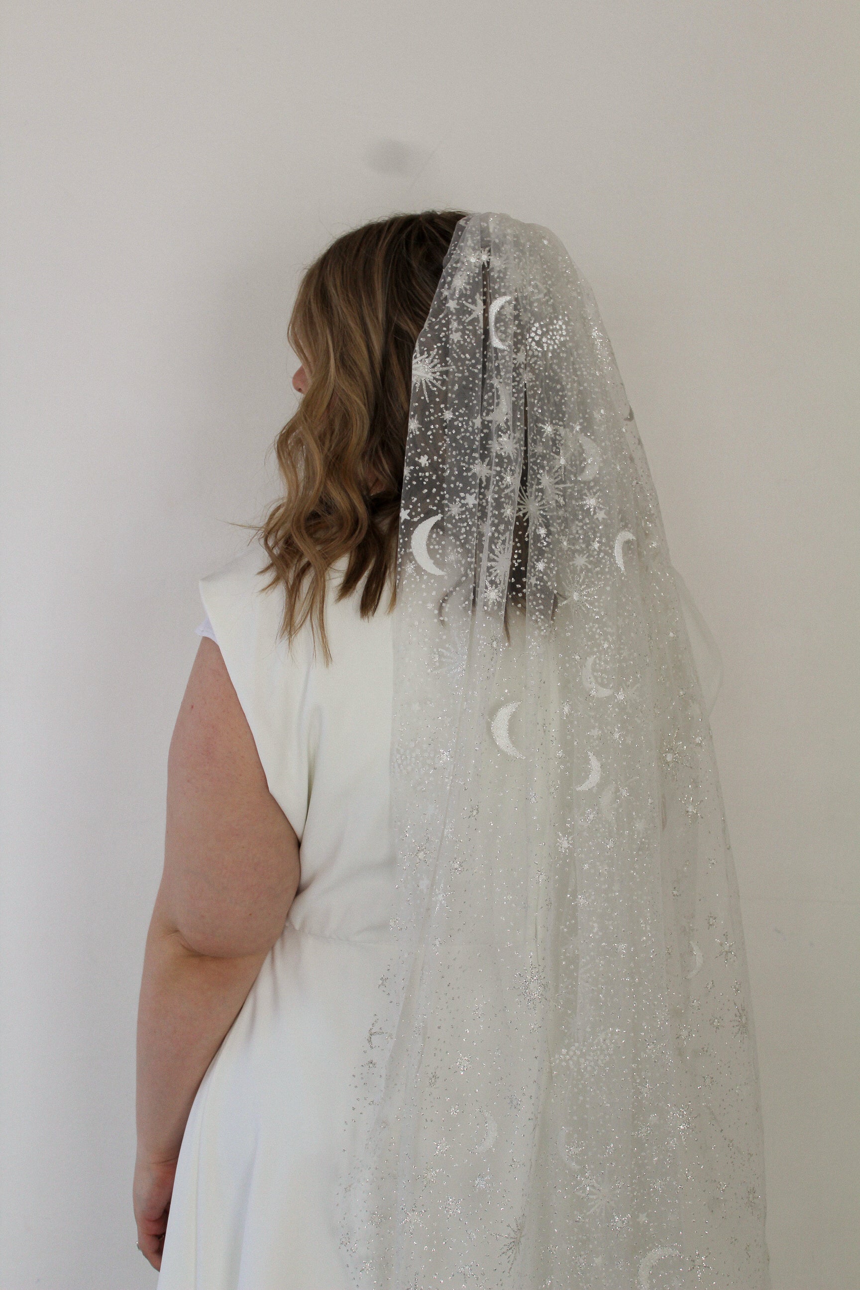 Glitter + sparkly celestial embroidery, white tulle mesh. Knee length 48" (1 available).