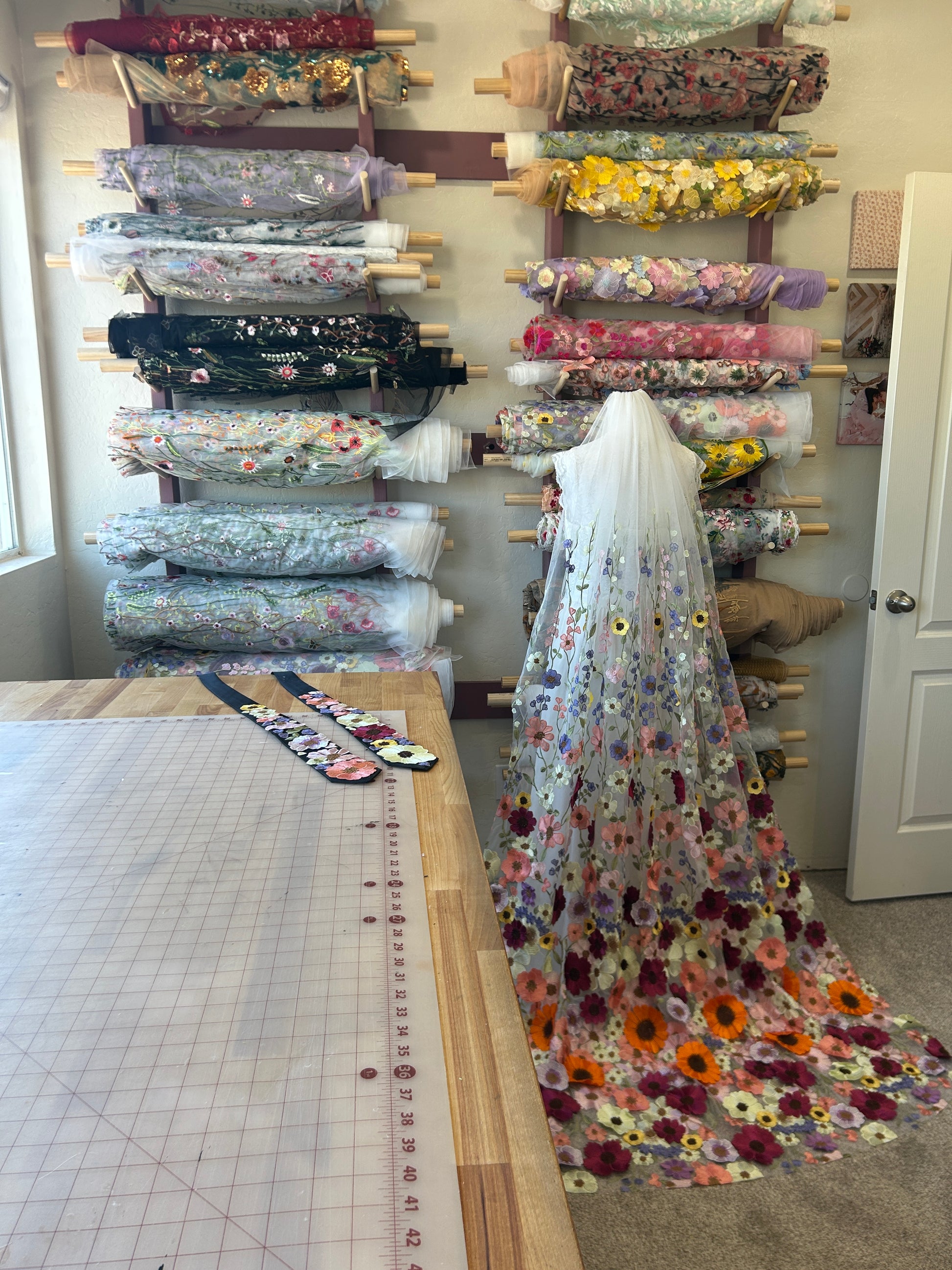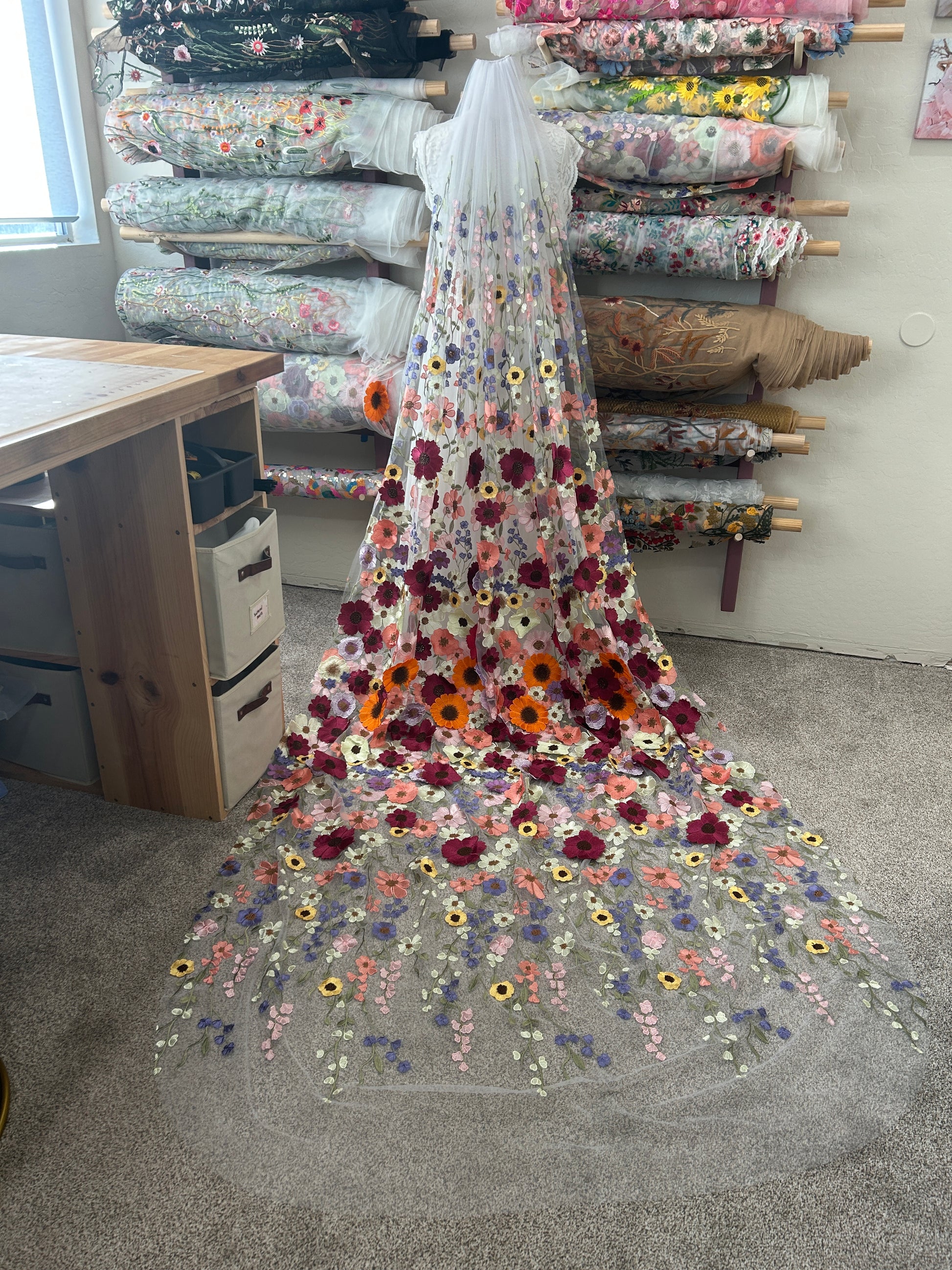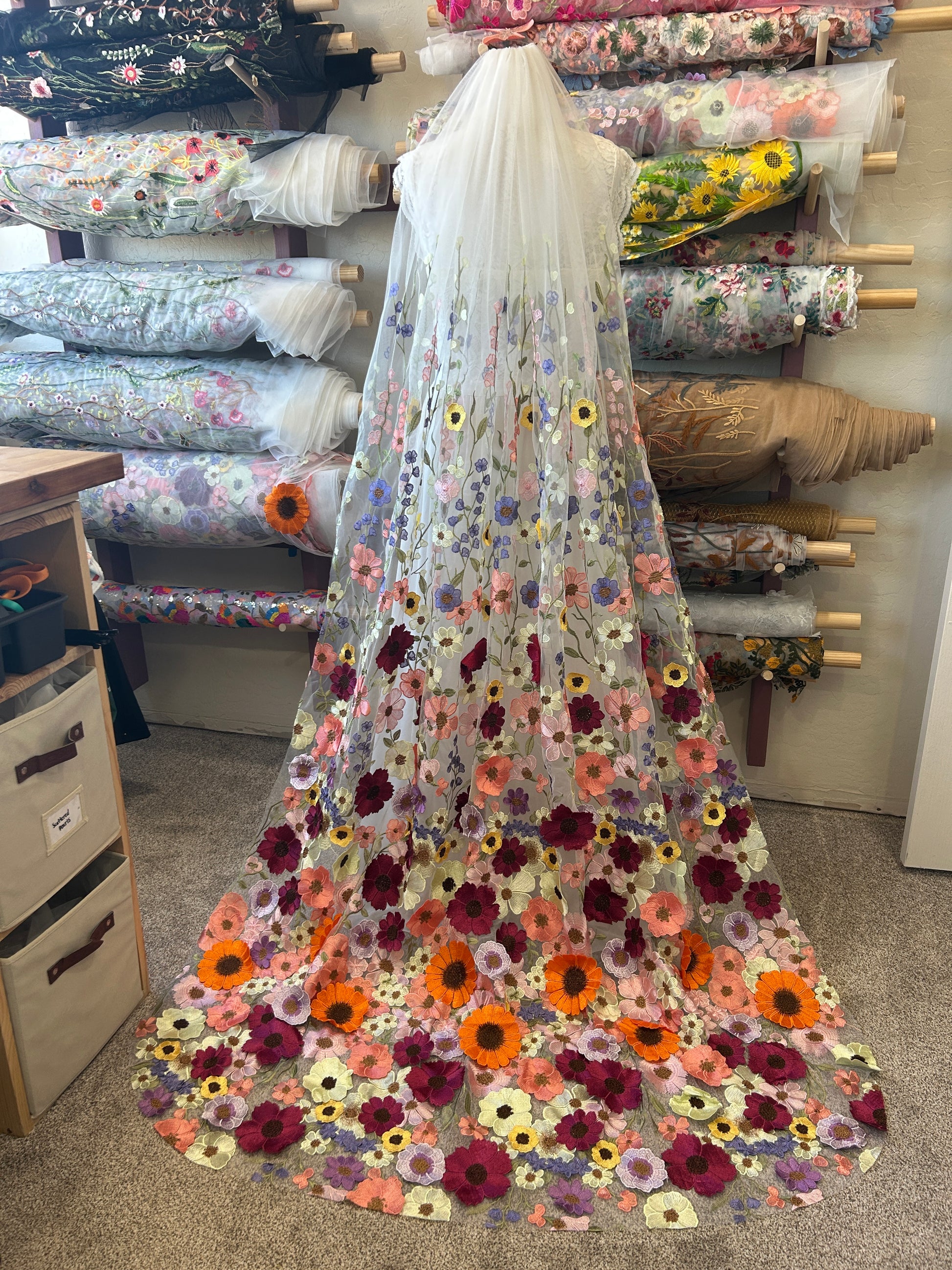 Lengths of floor, chapel & cathedral: The embroidered design finishes about 48" tall, so additional length is added by a small seam, blending the fabric together vertically. Small stitches follow a straight line along the veil & seam both ends of fabric together, giving a longer length.