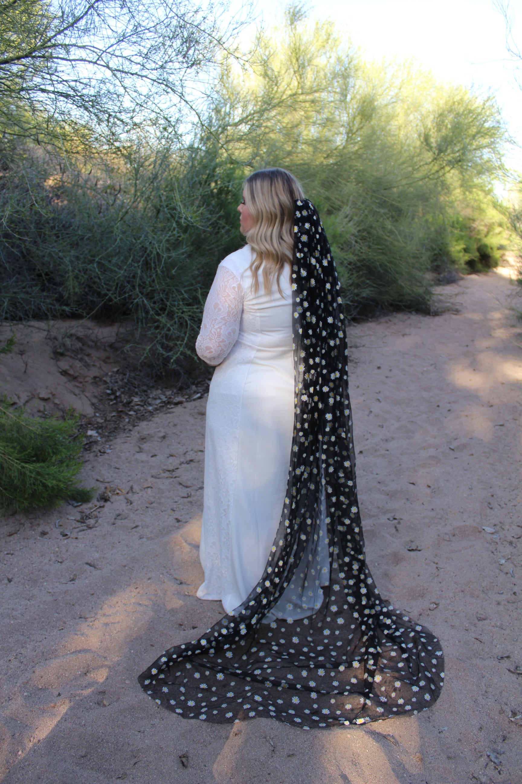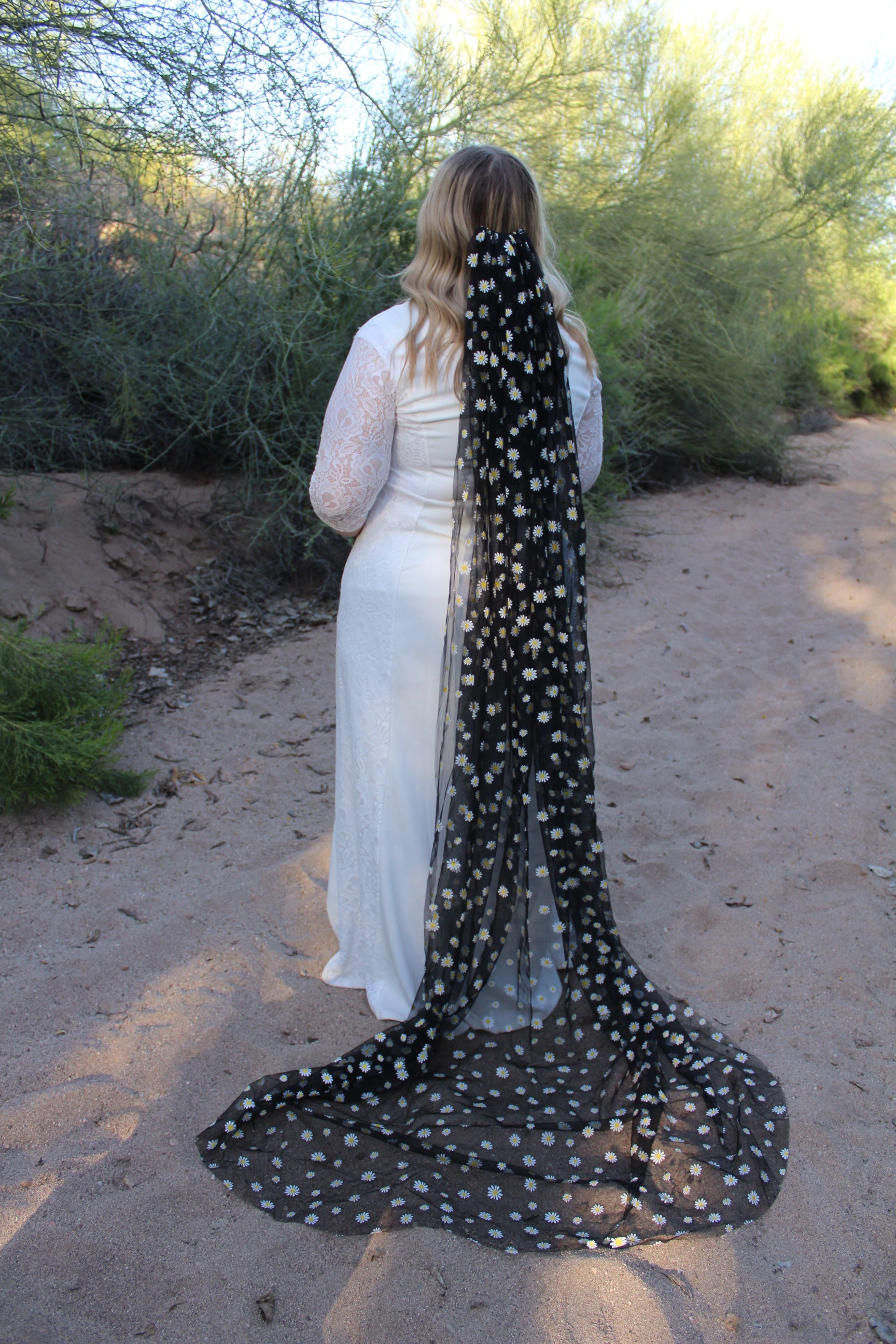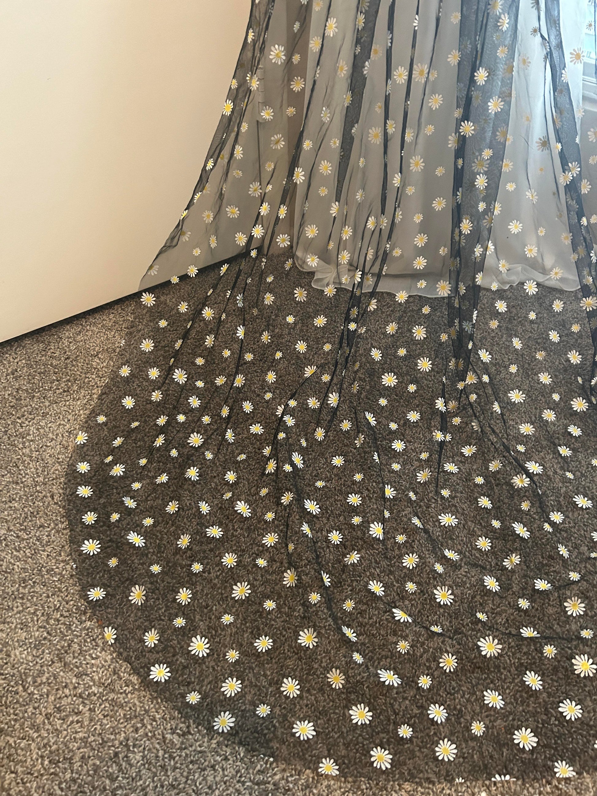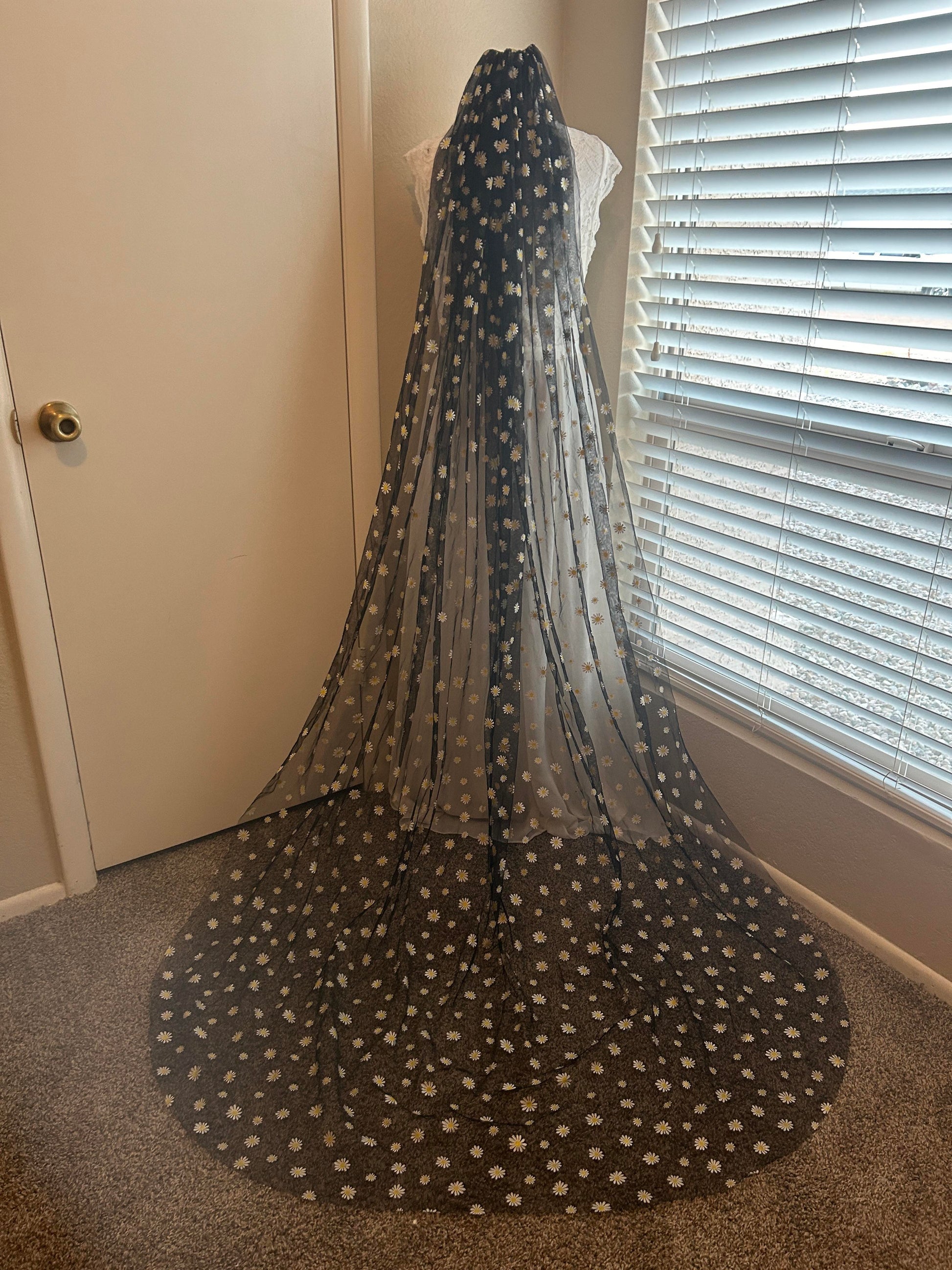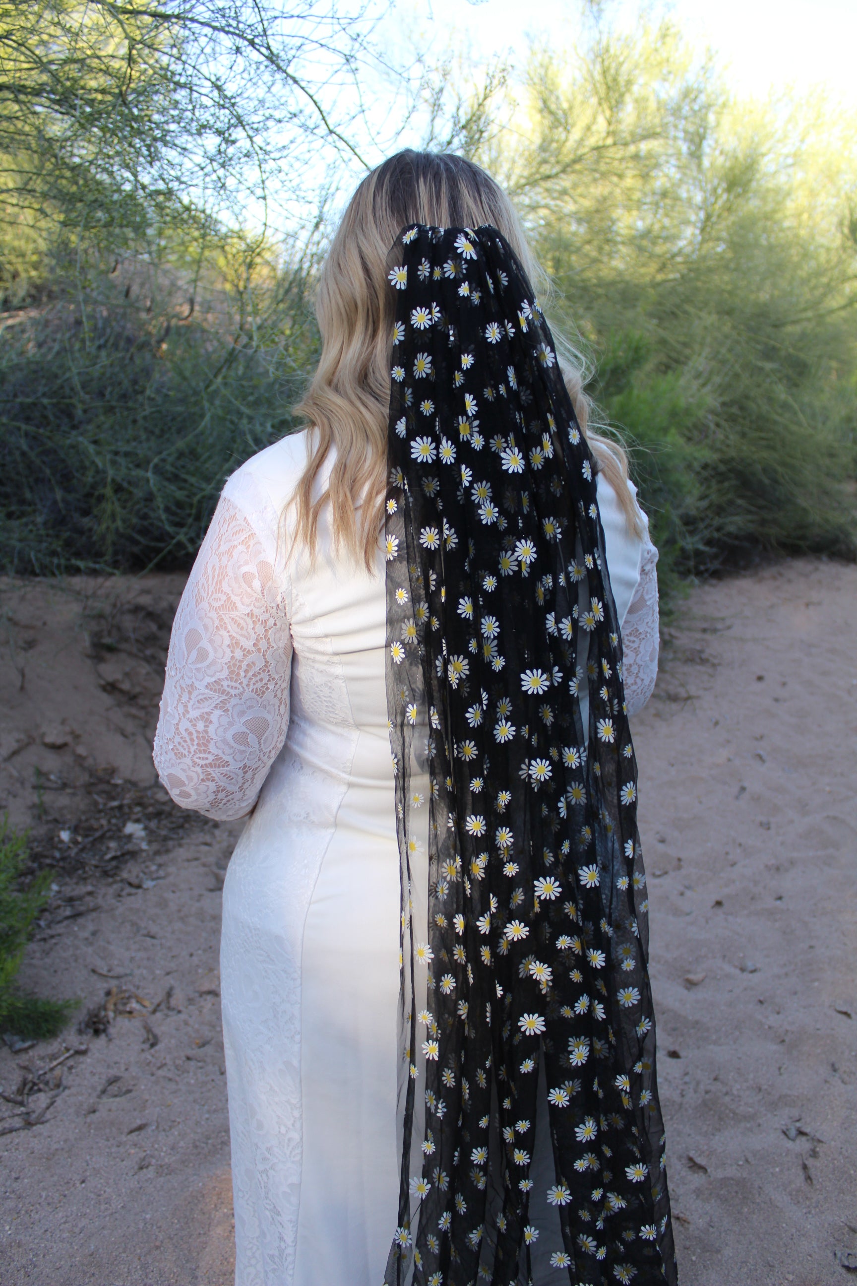 Daisy Black Tulle, floor length (78"). Raw Cut edge. Hand sewn to a silver metal comb (1 available).