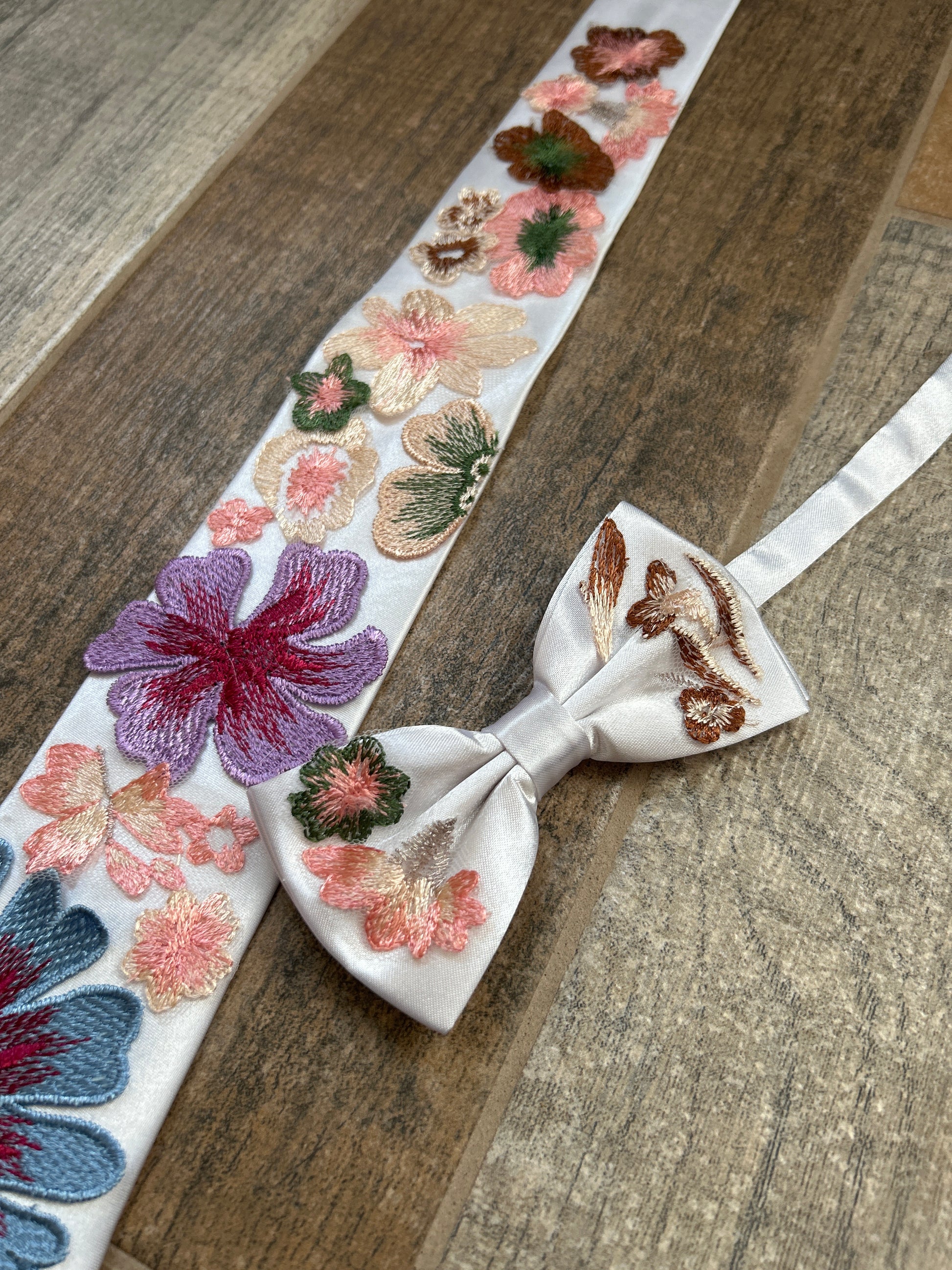 • Embroidery hand cut from fabric, hand-attached to the main bow tie area