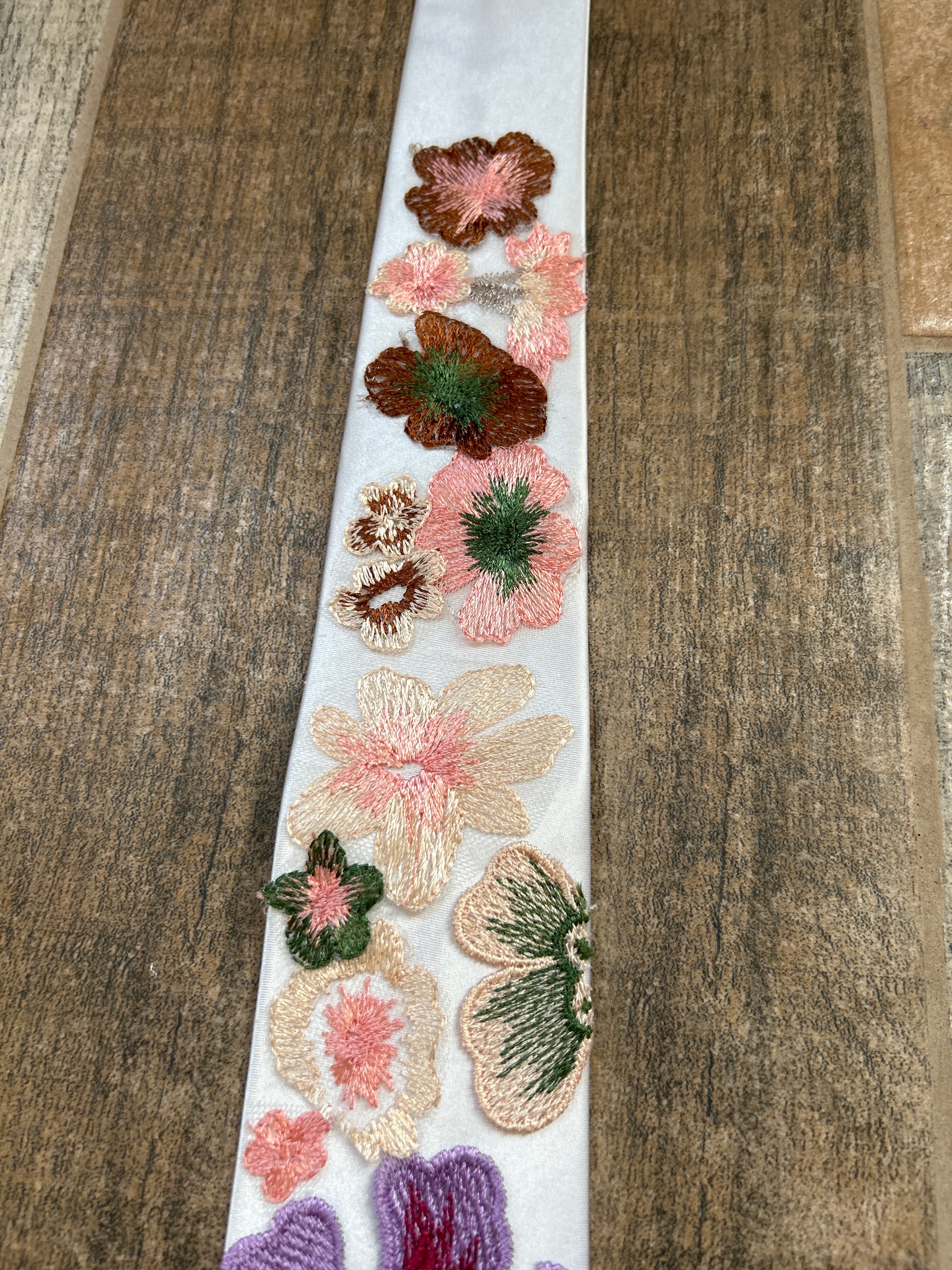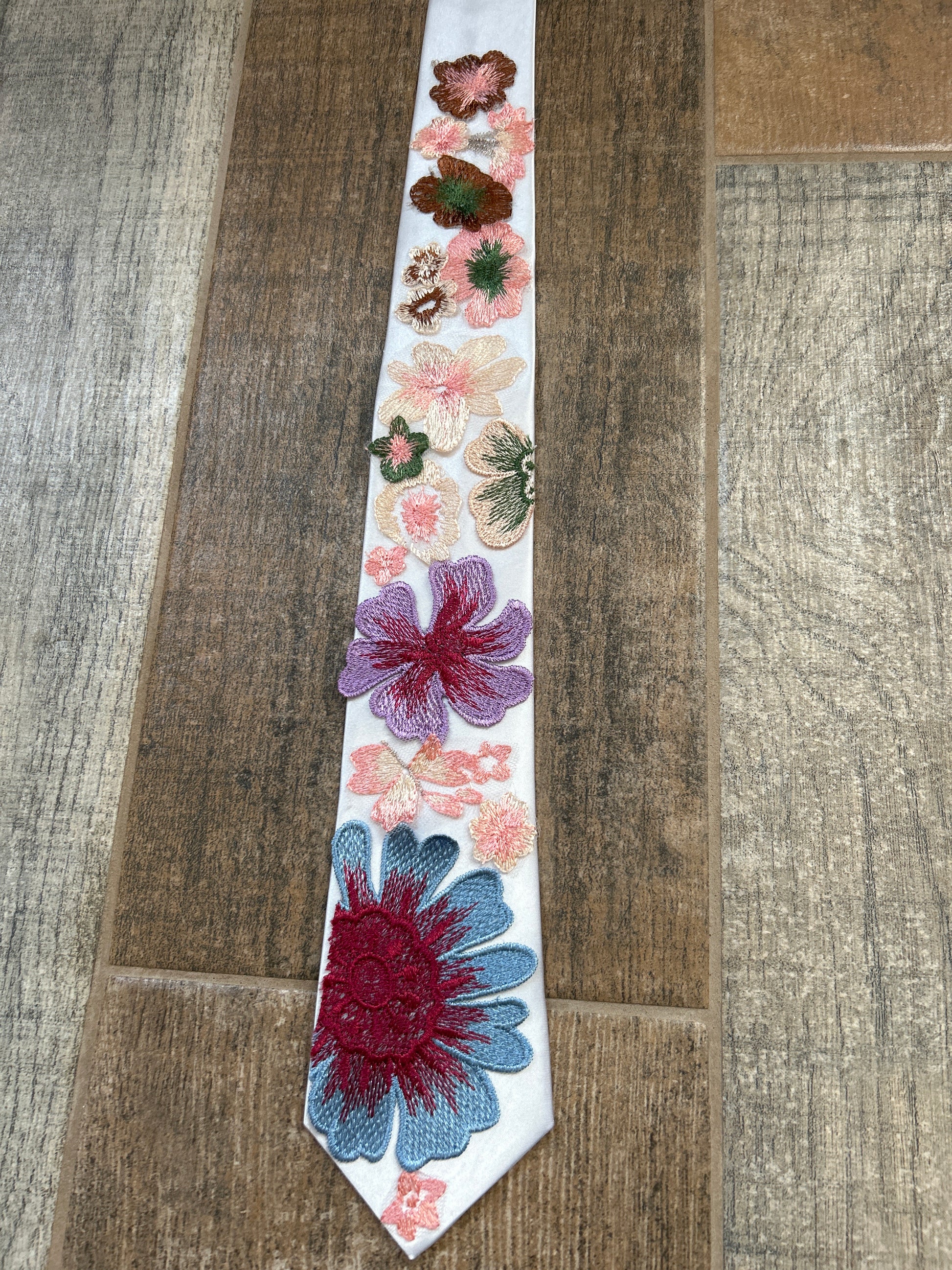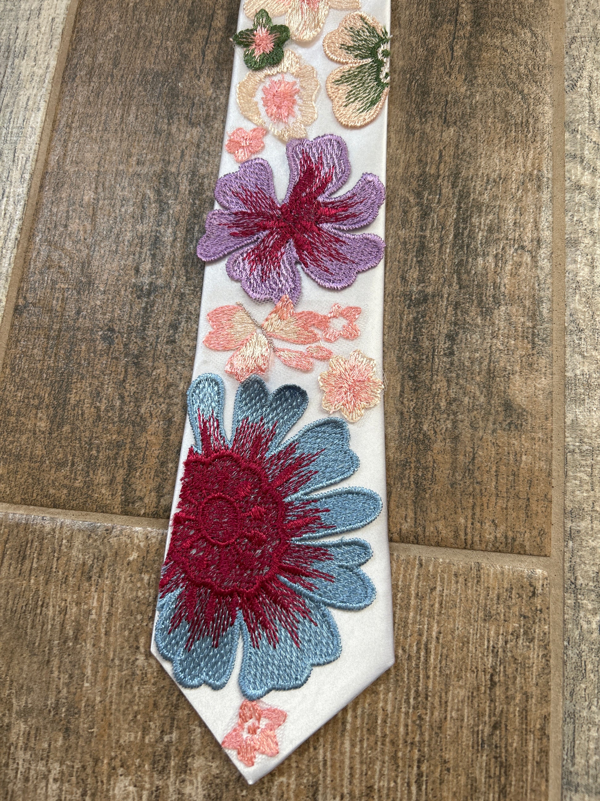 Each product is designed to order, making it unique and not like another tie. Fabric may vary according to availability of materials. Please note that computer screens, lighting & editing may vary in colors. All embroidery is hand cut from fabric, hand attached and glued to the tie.