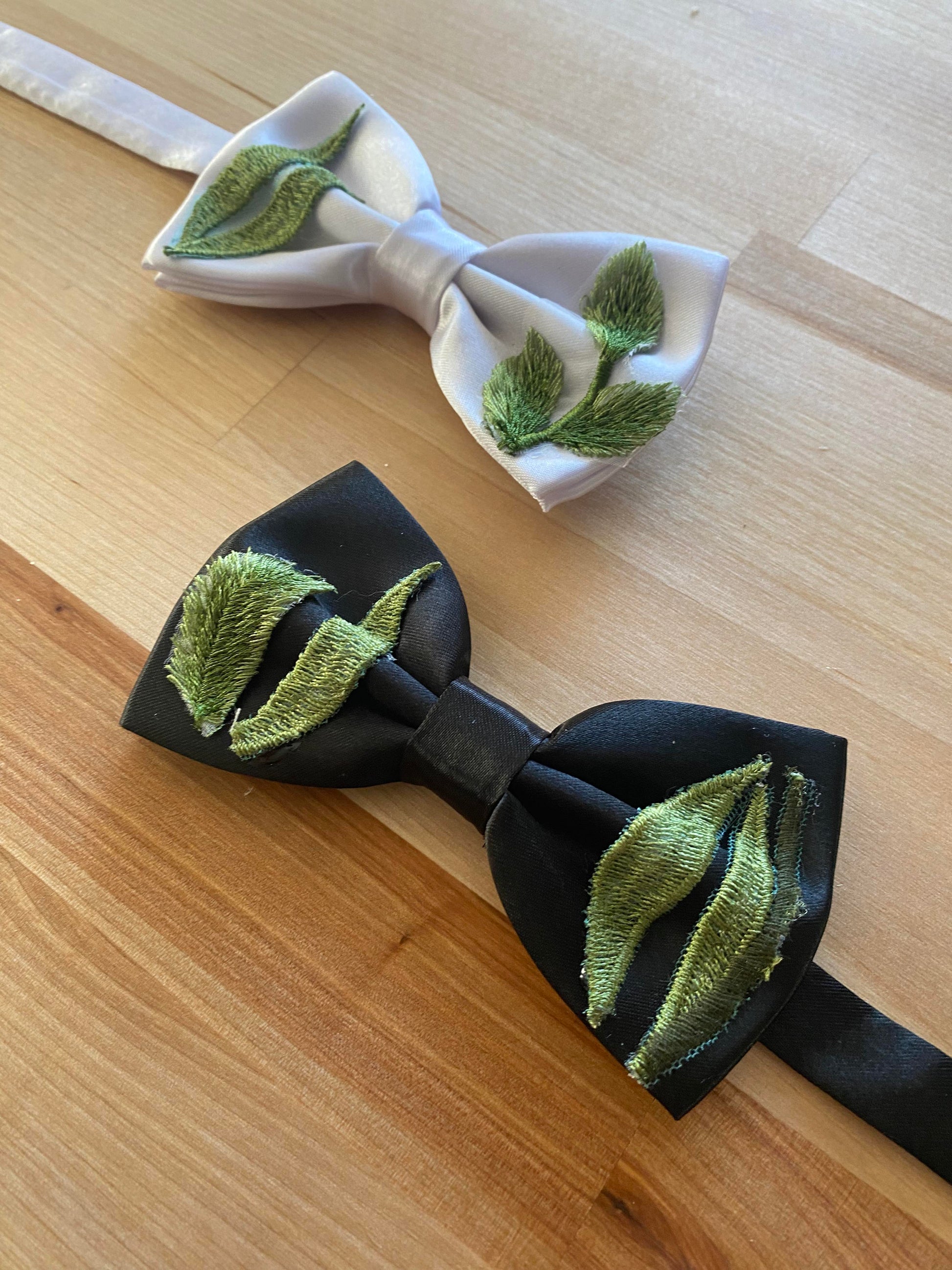 - Embroidery hand cut from fabric, hand-attached to the main bow tie area