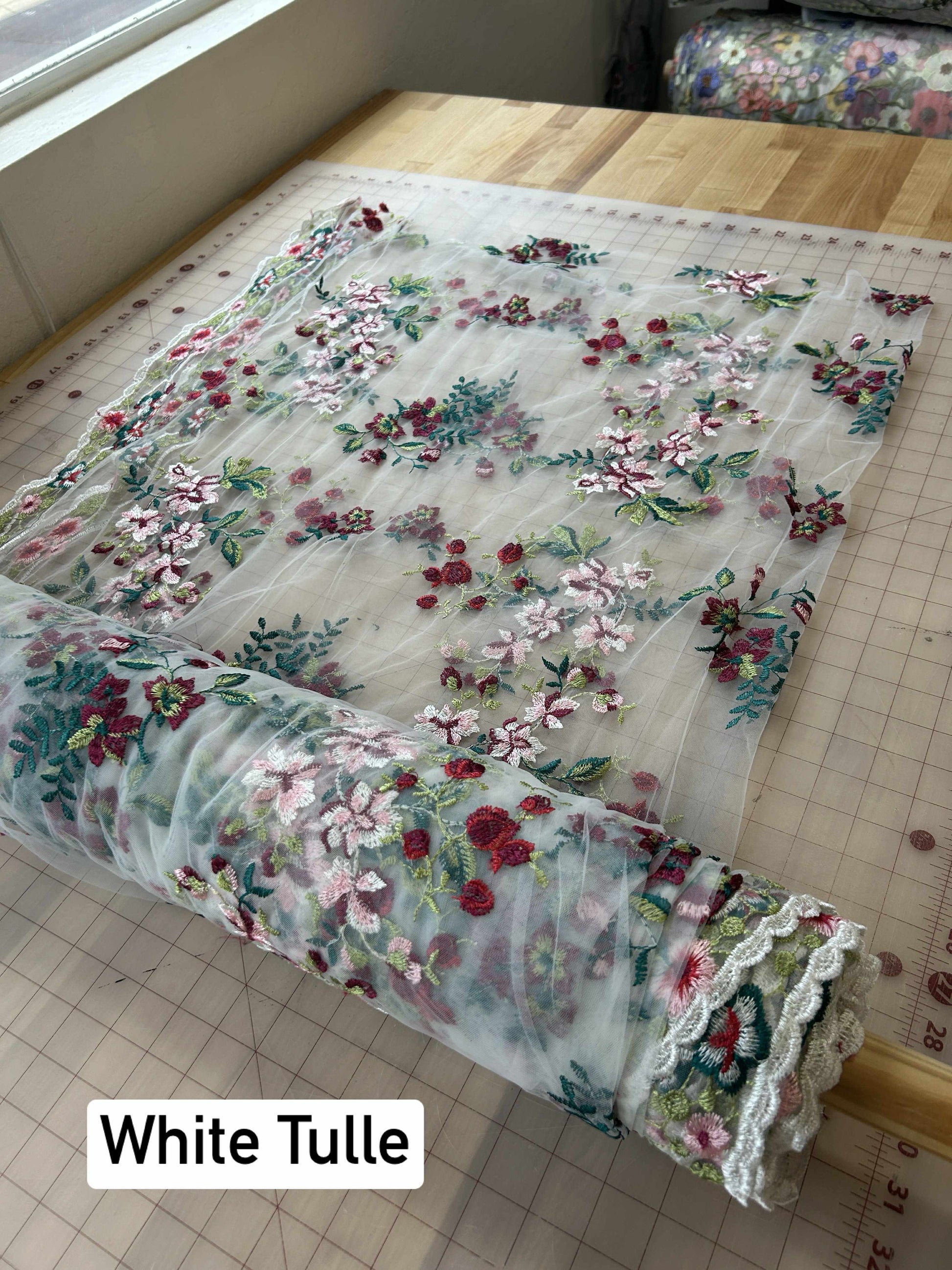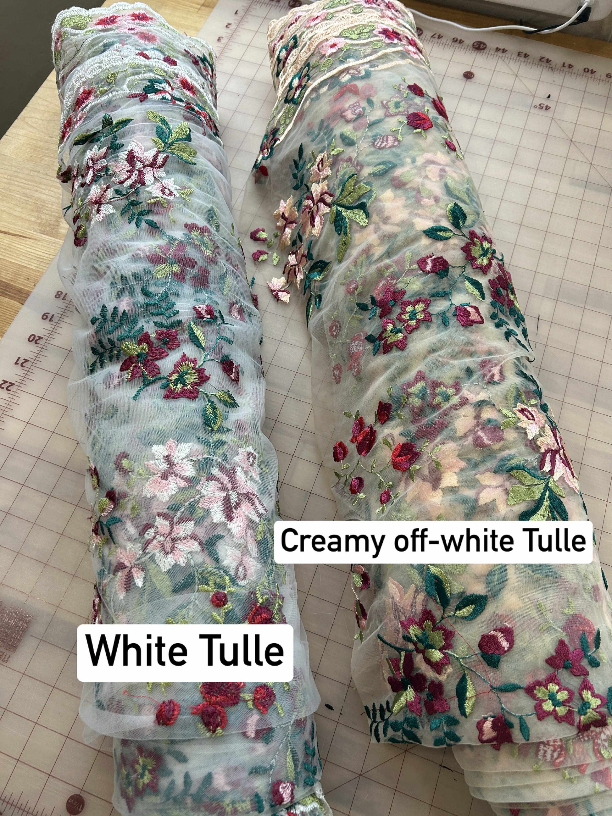 • Creamy off-white tan or white tulle base with embroidered flowers and greenery