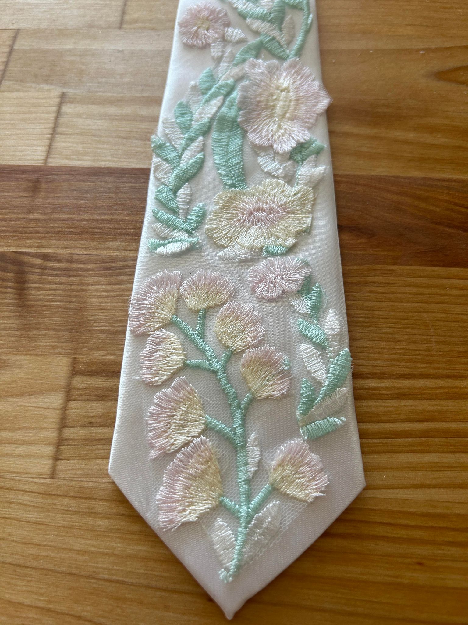 - Embroidery hand cut from fabric, hand-attached to the main area that shows when properly tied, 18"
