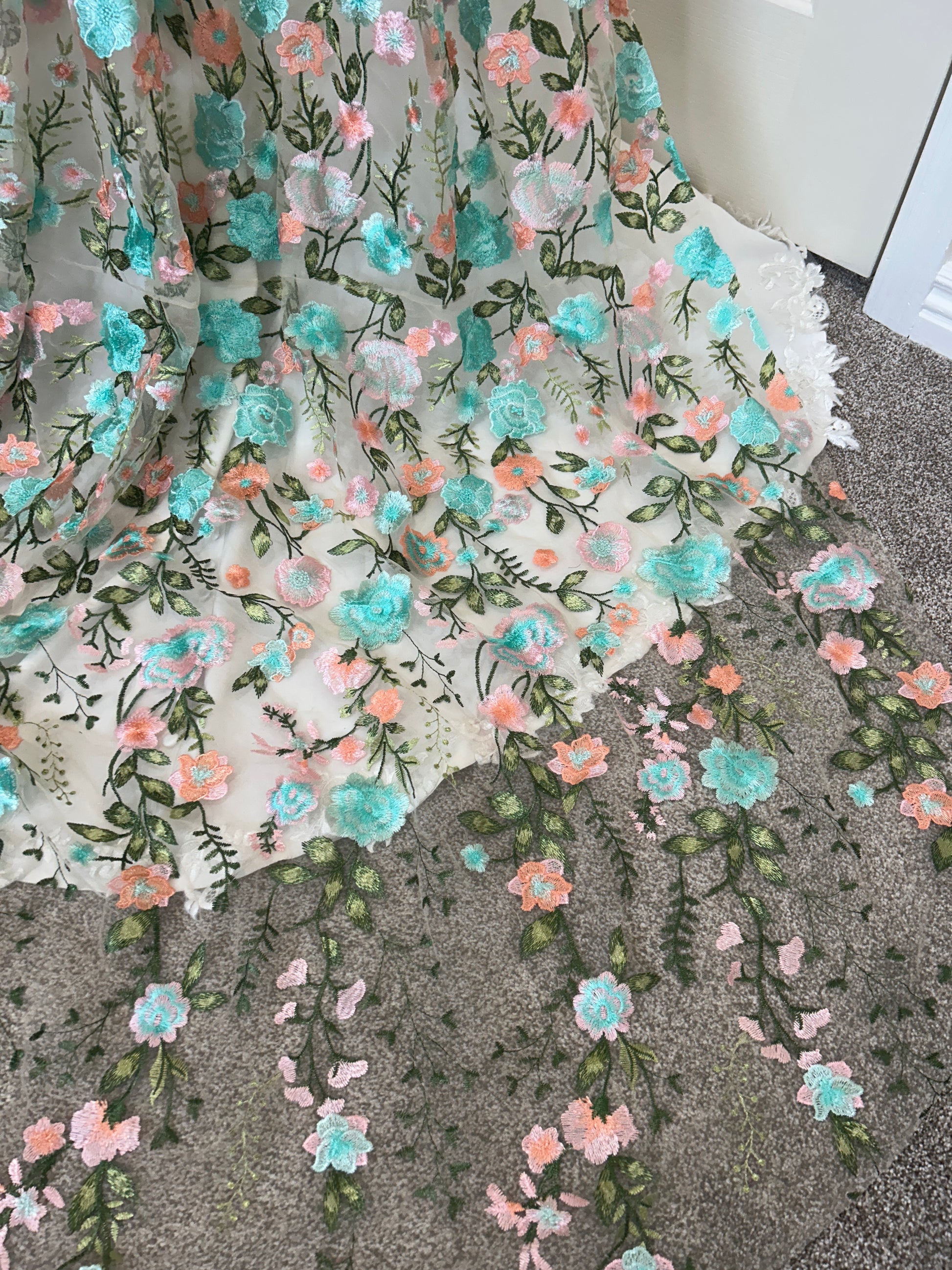 - Light Tan tulle with roses and greenery embroidered