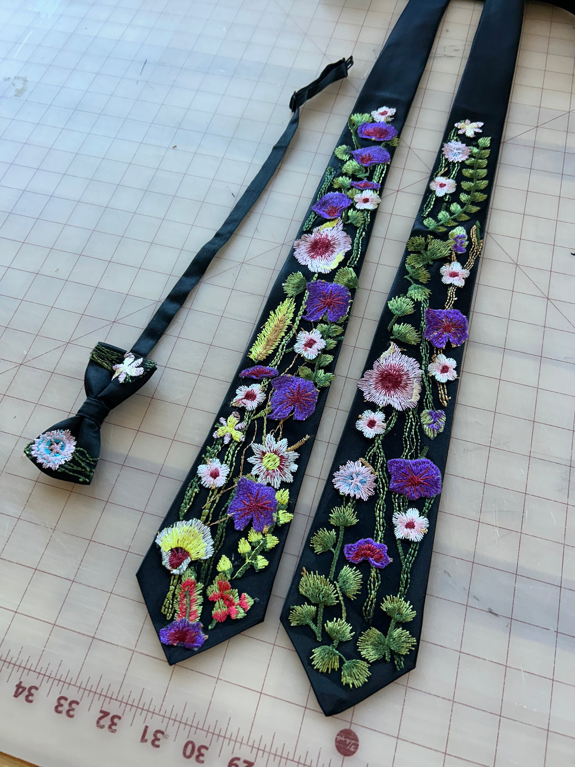 Each product is made to order, not one tie is alike. Ties are made with what embroidery sections are available to use at the time of making your order.  Fabric may vary according to availability of materials. Please note that computer screens, lighting & editing may vary in colors.