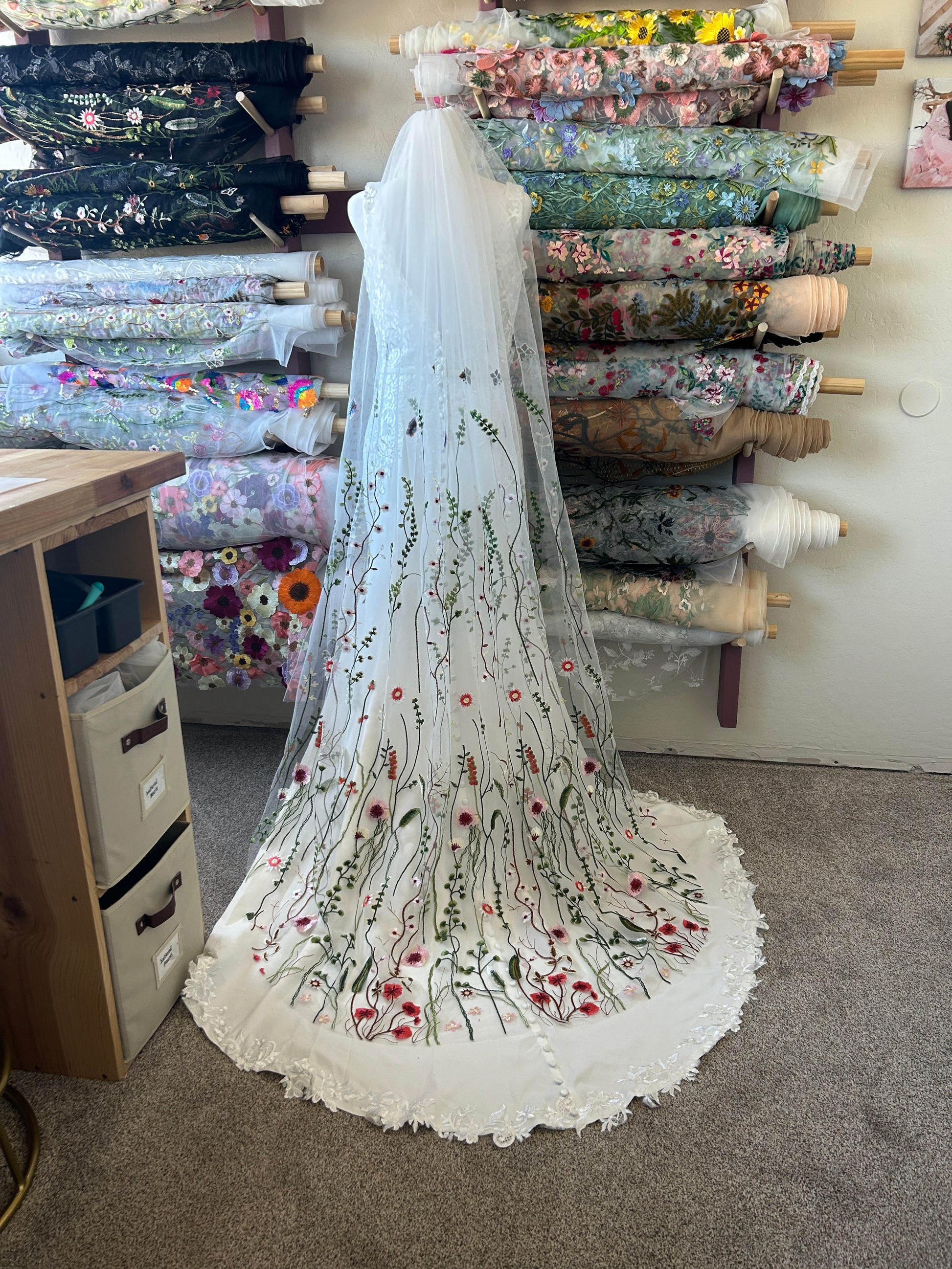 • Off-white tulle with wildflowers, greenery & butterflies embroidered