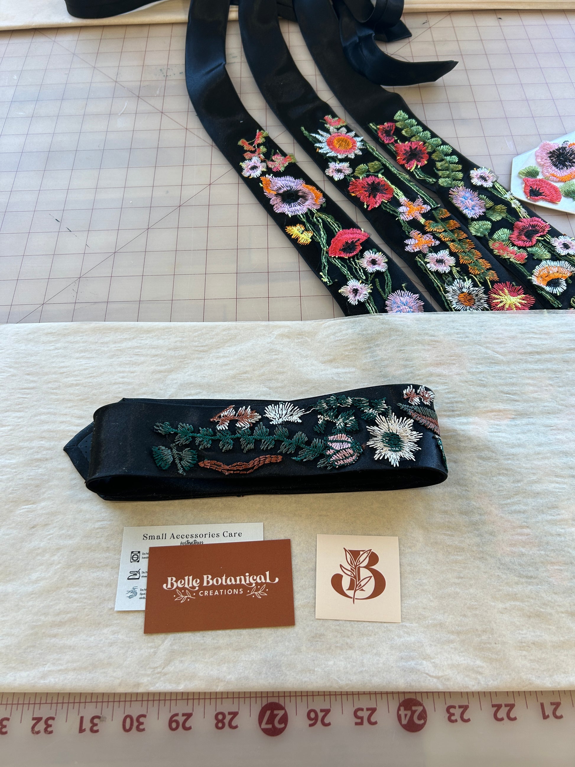 - Embroidery hand cut from fabric, hand-attached, glued down to the main area that shows when properly tied, 18"
